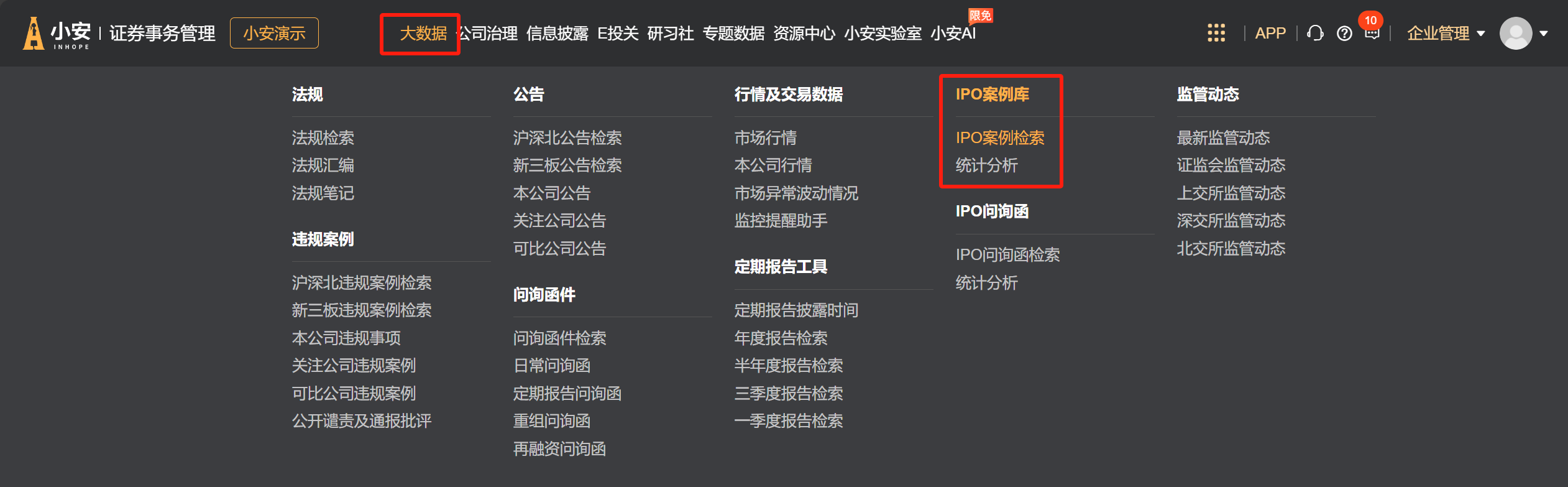 在【大数据】菜单下,点击【IPO案例】菜单,进入案例页面。