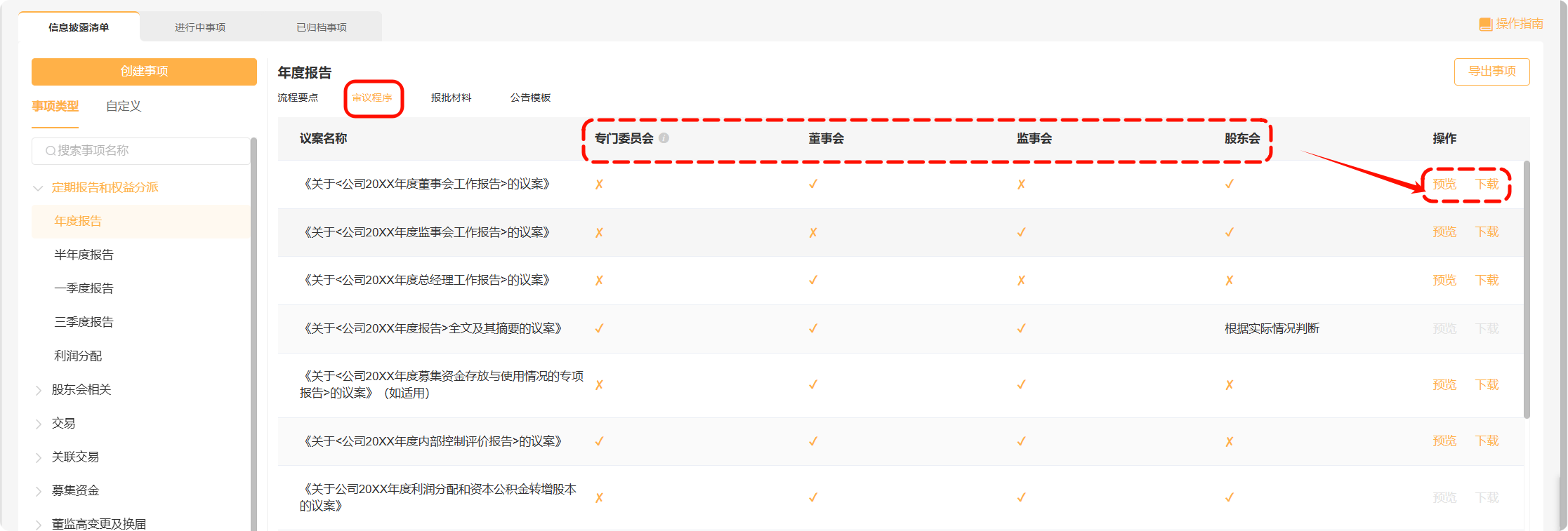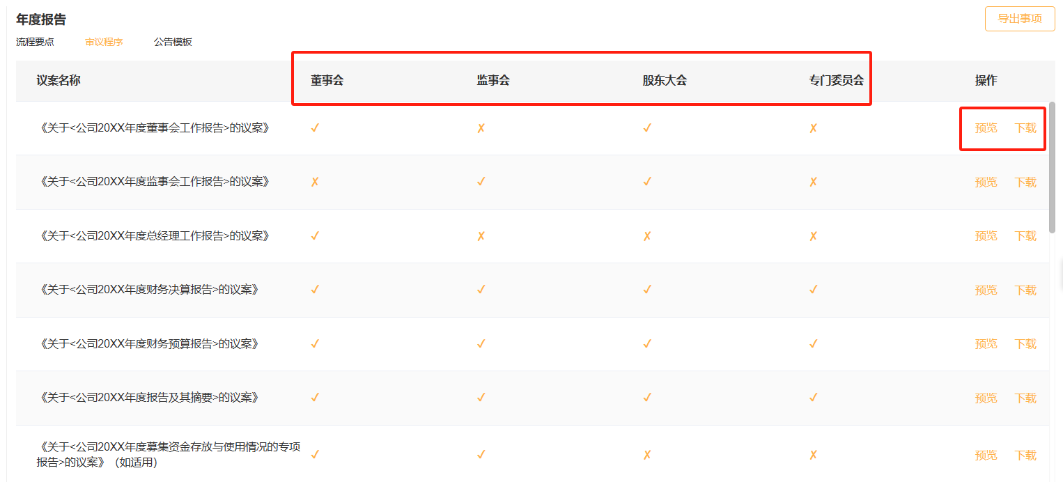 审议程序中,不仅可以参考查看需要审议的议案,系统还提供了部分议案模板,可以在线预览或下载。
