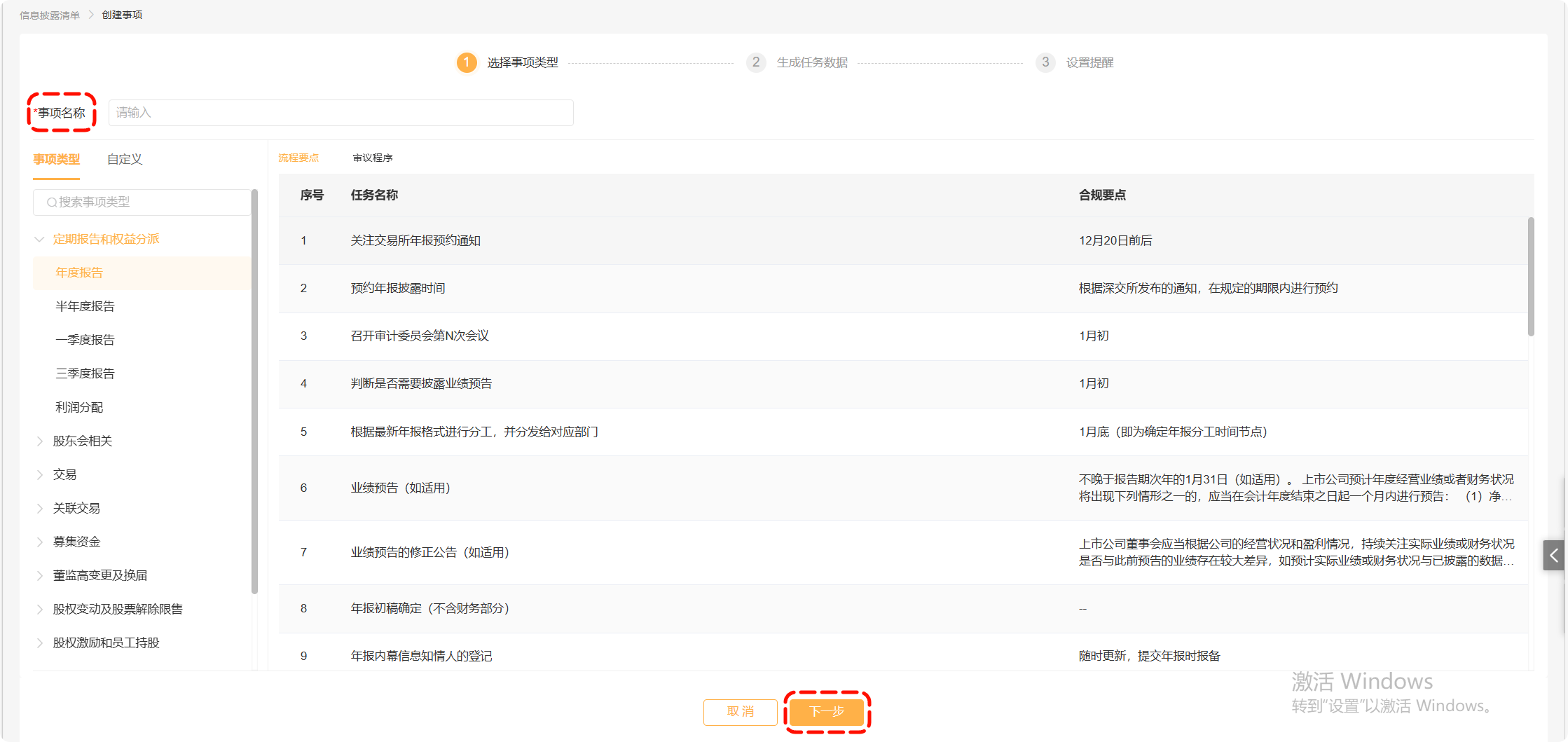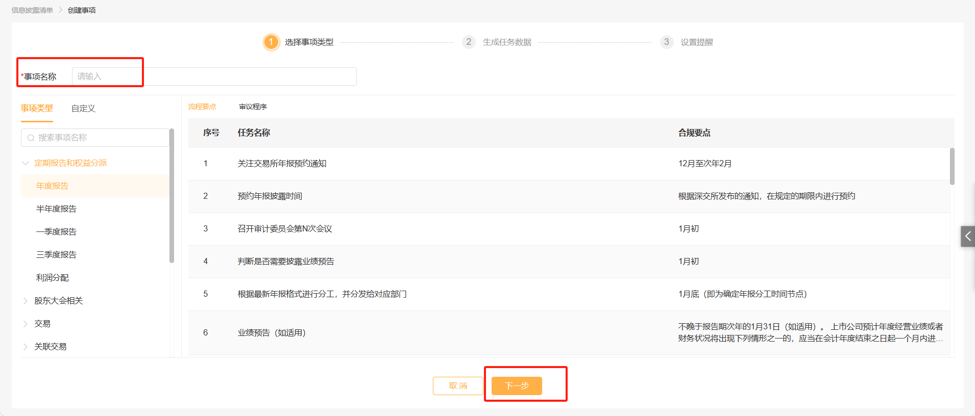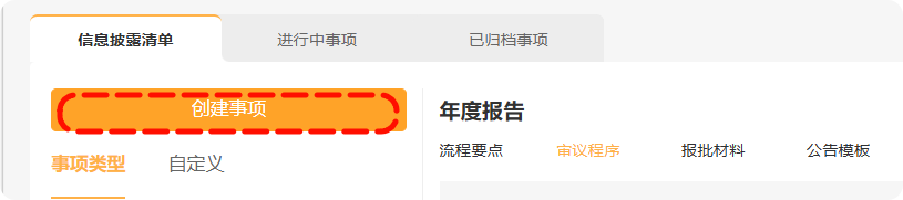 点击右上角【创建事项】,输入事项名称,选择要新建的事项,可以从系统模板或自定义模板中选择模板。
