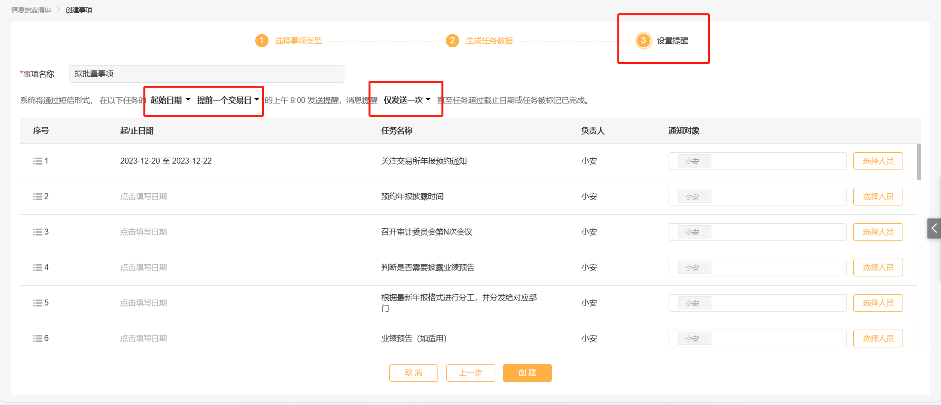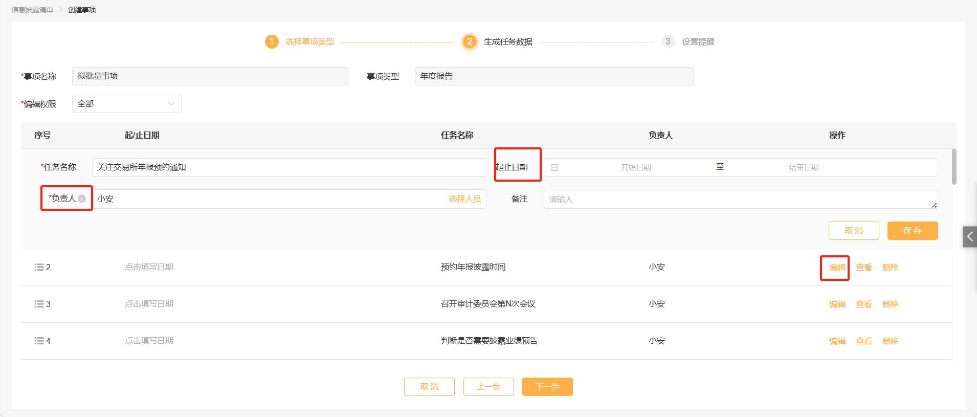点击下一步,生成任务阶段,点击编辑,可以设置对应任务的具体时间节点,并分配负责人。