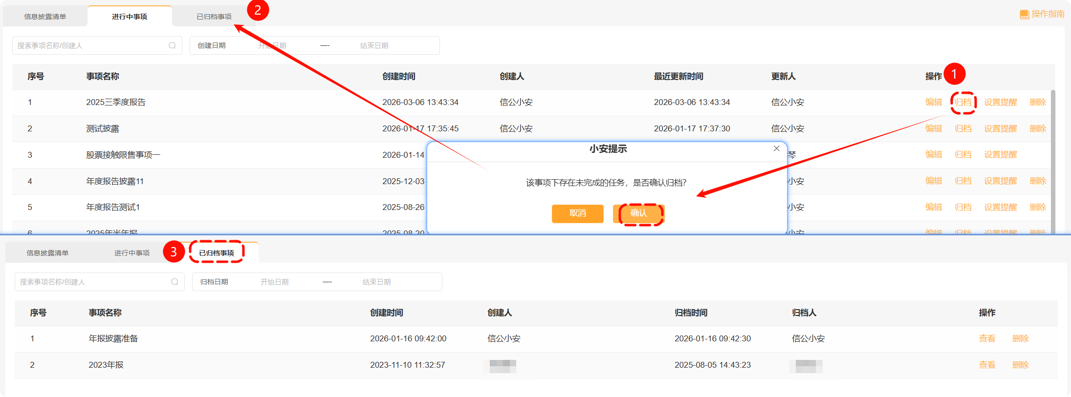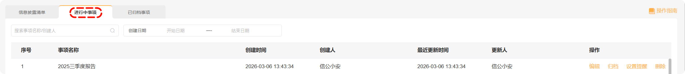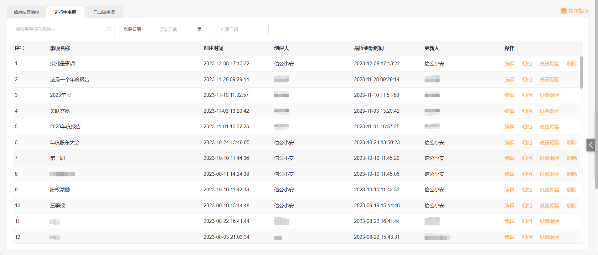 创建完成后,会跳转至【进行中的事项】模块,可以对事项进行编辑、归档、设置提醒等操作。