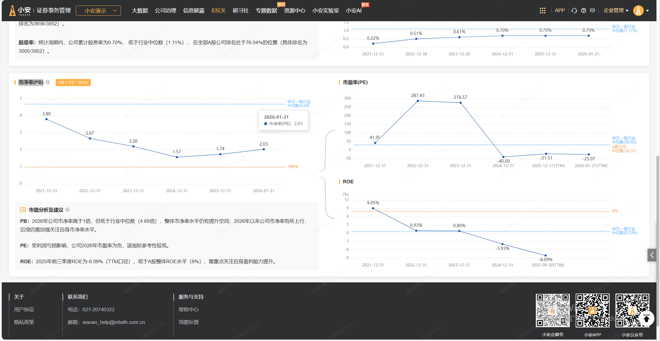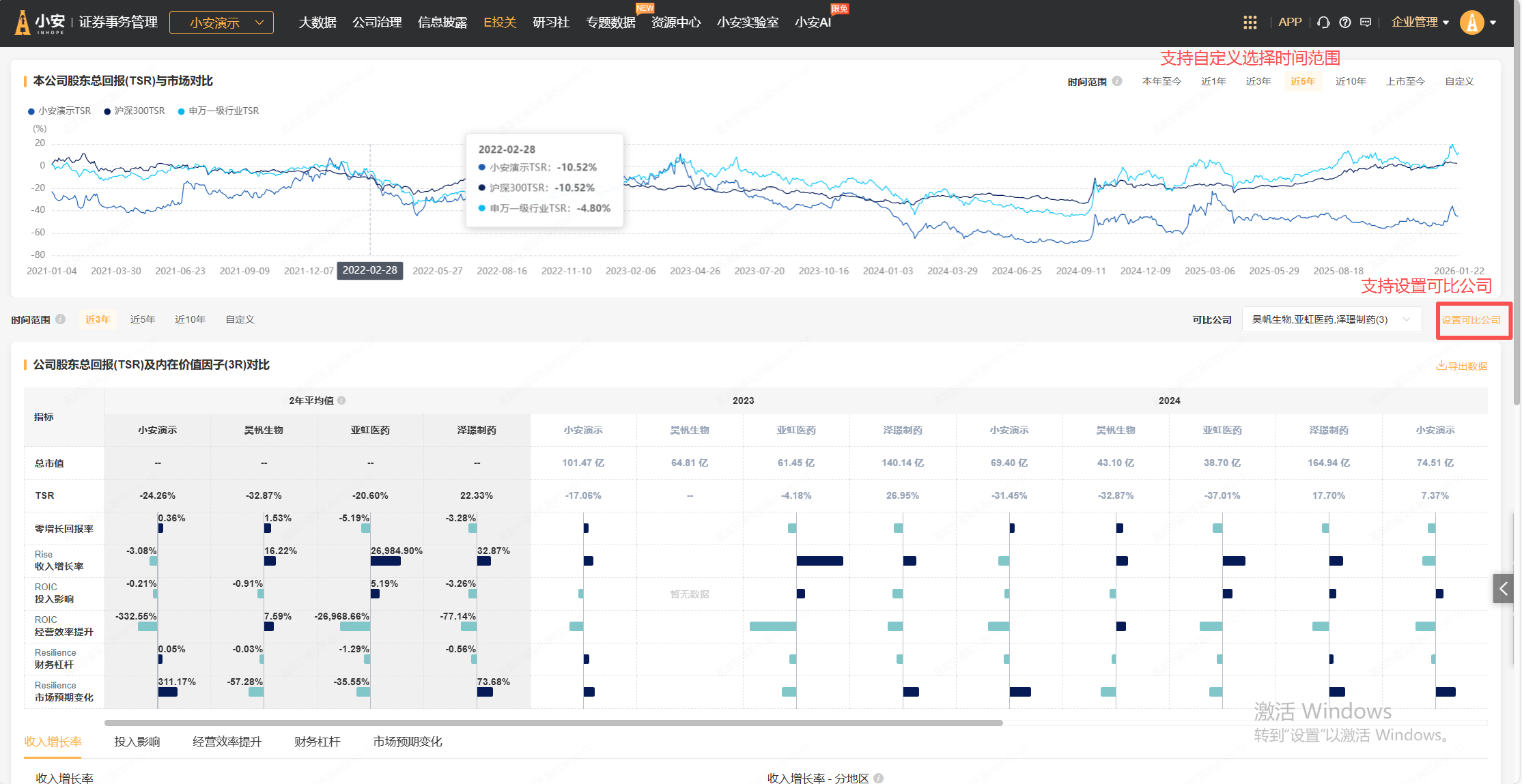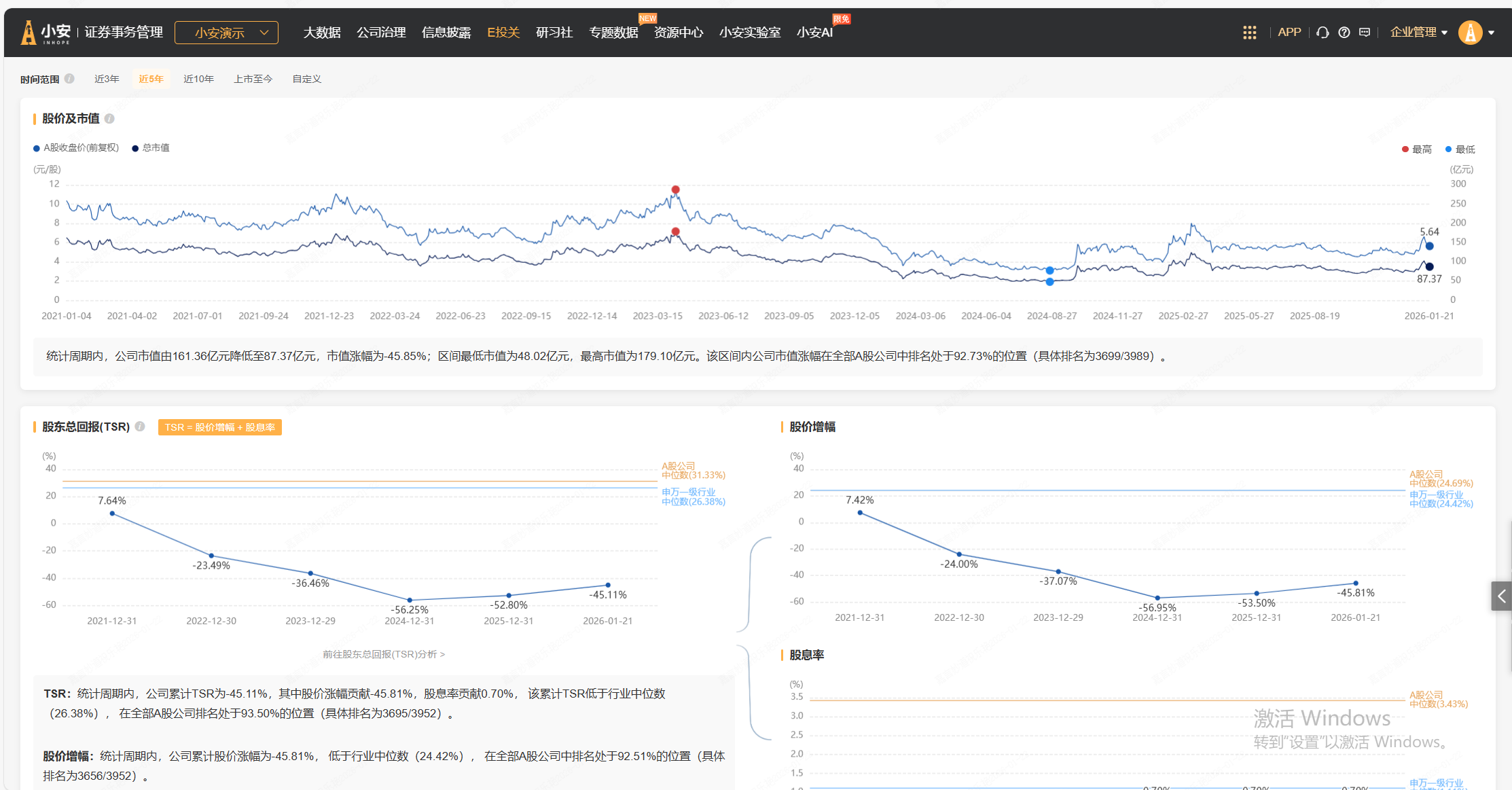 股价及市值的折线图反映了一定时间范围内股价/市值变动趋势,在下方股东总回报(TSR)折线图中,支持对比公司股东总回报(TSR)和市净率(PB)与行业/全市场水平。