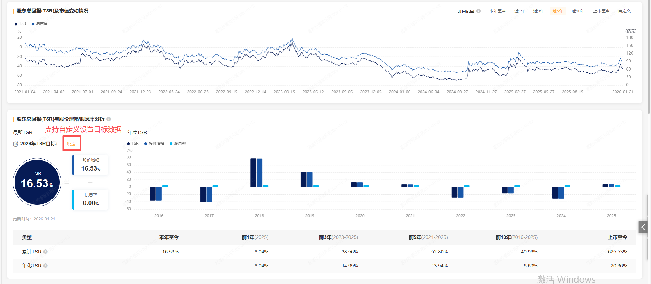 展示了特定时间段内股东总回报(TSR)和市值的趋势对比,柱状图中拆解了股东总回报(TSR)不同年度的指标数据结构,同时展示了最新的股东总回报(TSR)数值以及年度股东总回报(TSR)目标。