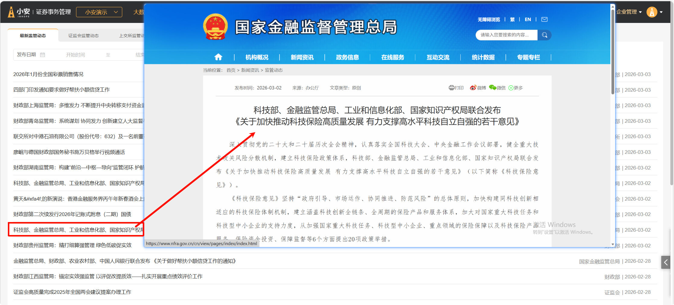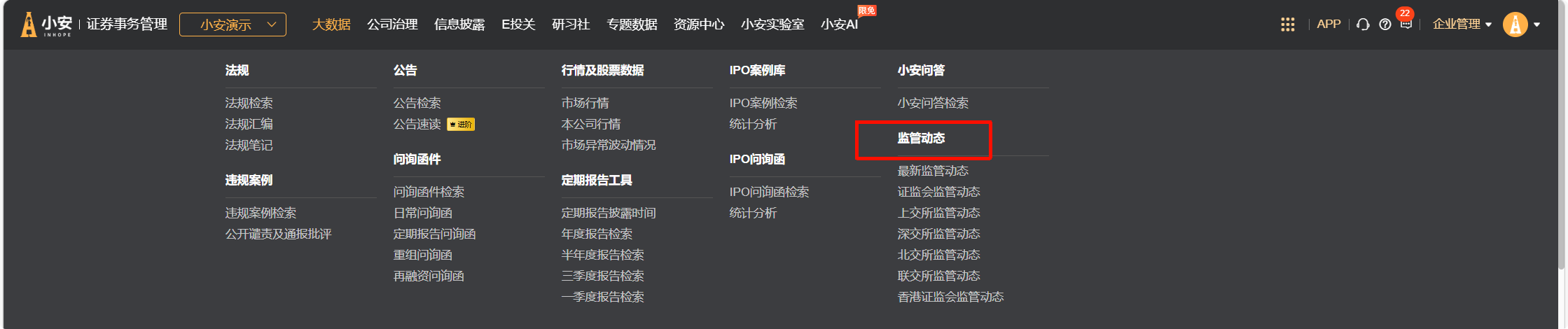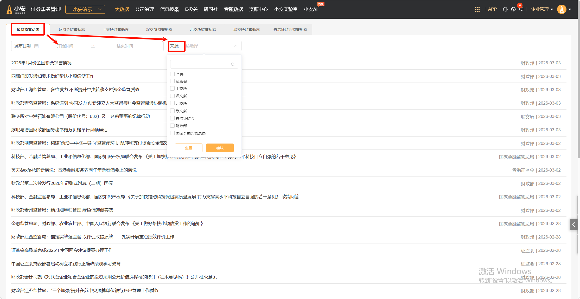 小安监管动态收录了证监会及沪深北交易所最新发布的最新发布的监管信息,可以根据使用需求切换,点击监管动态标题后可在相应的原始信息界面查看详情内容。