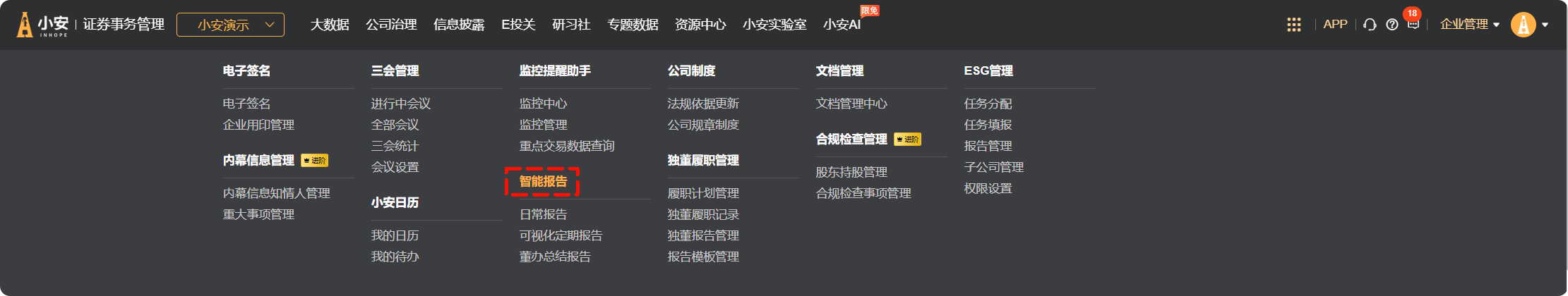 在【公司治理】菜单下,【智能报告】进入智能报告页面。