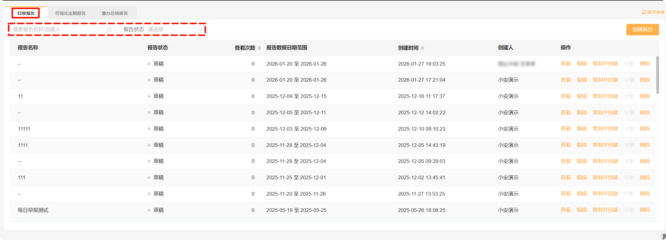 点击右上角【创建报告】,选择“日常报告”,进入报告创建页面。