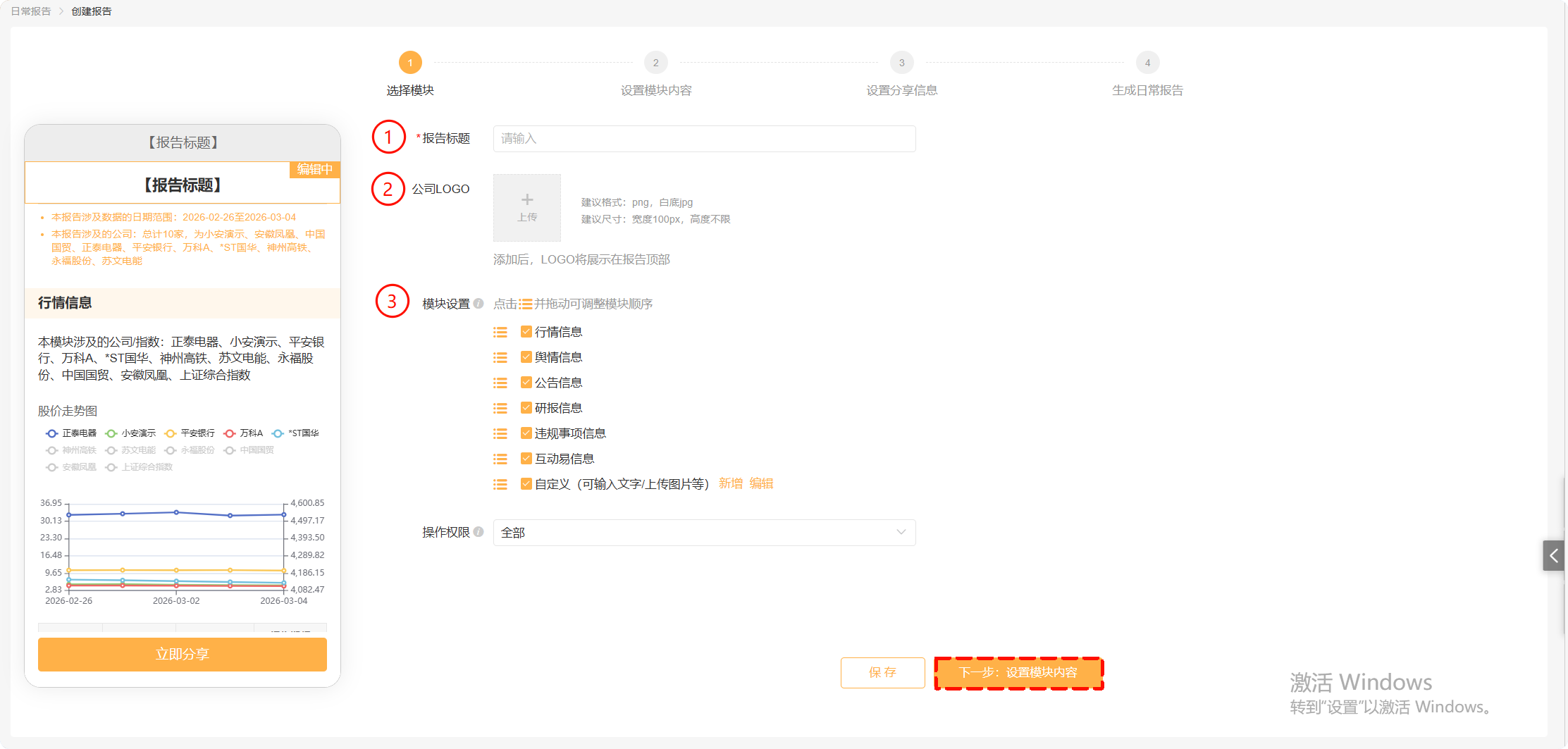 进入日常报告创建页面,可以编辑“标题”、“logo”,选择“模块”内容;