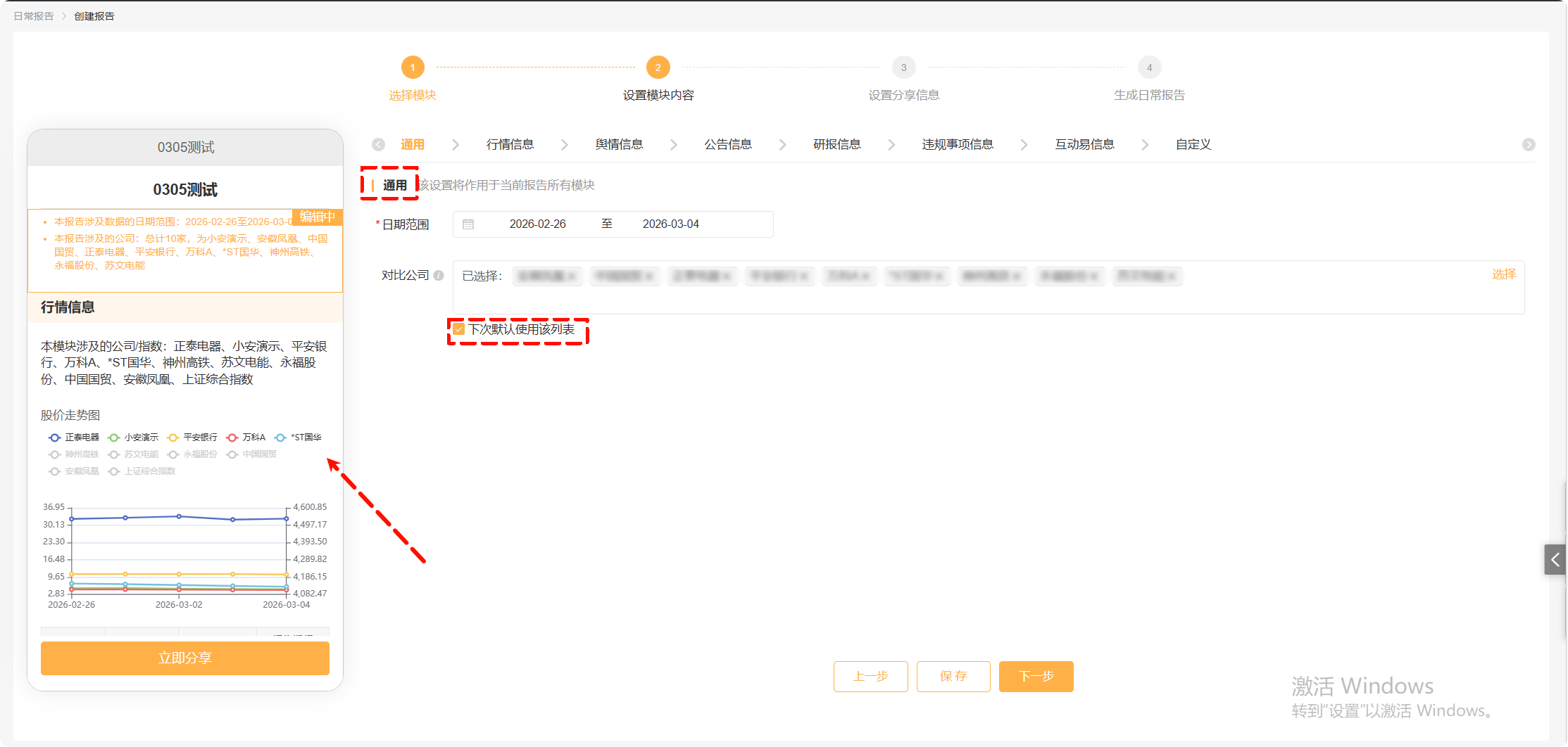 进入“通用”信息填写页面。选择对比的日期、设定对比的公司,可以将此次对比的公司设为默认列表。左侧为实时的预览。
