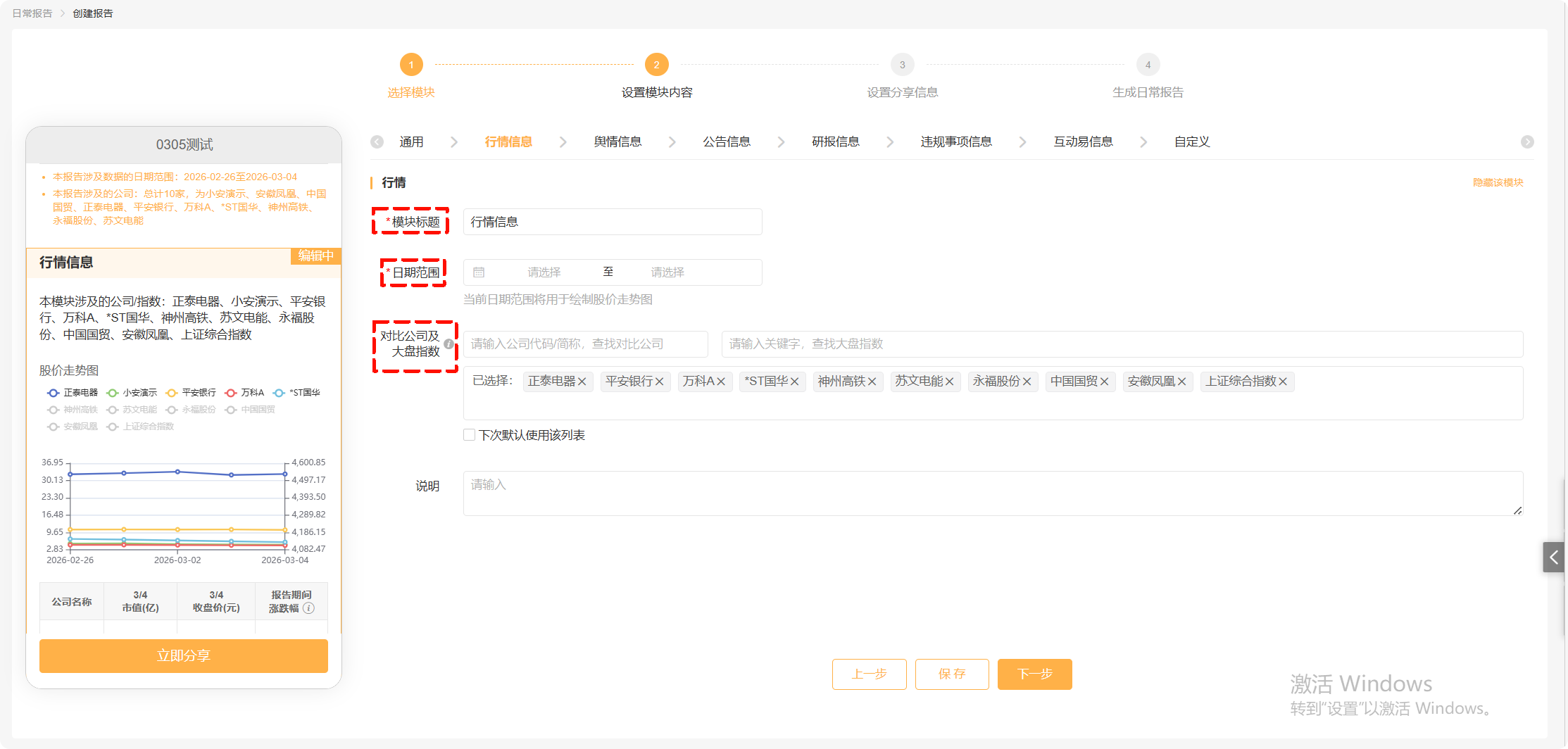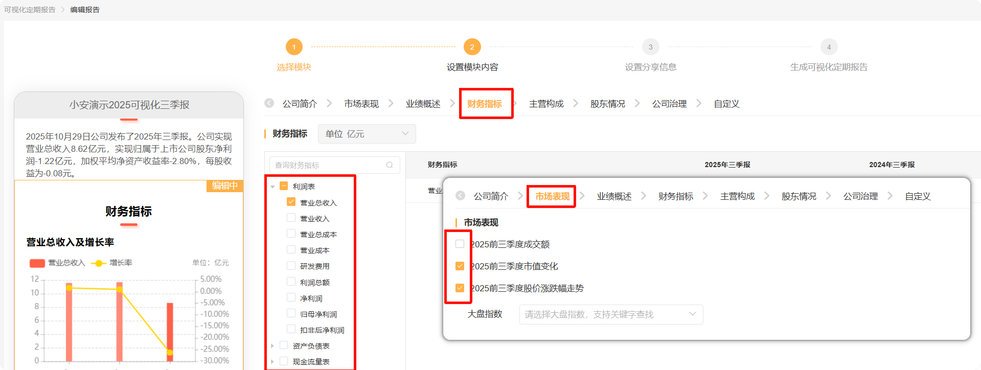 “市场表现”“财务指标”支持通过勾选,添加报告内容。