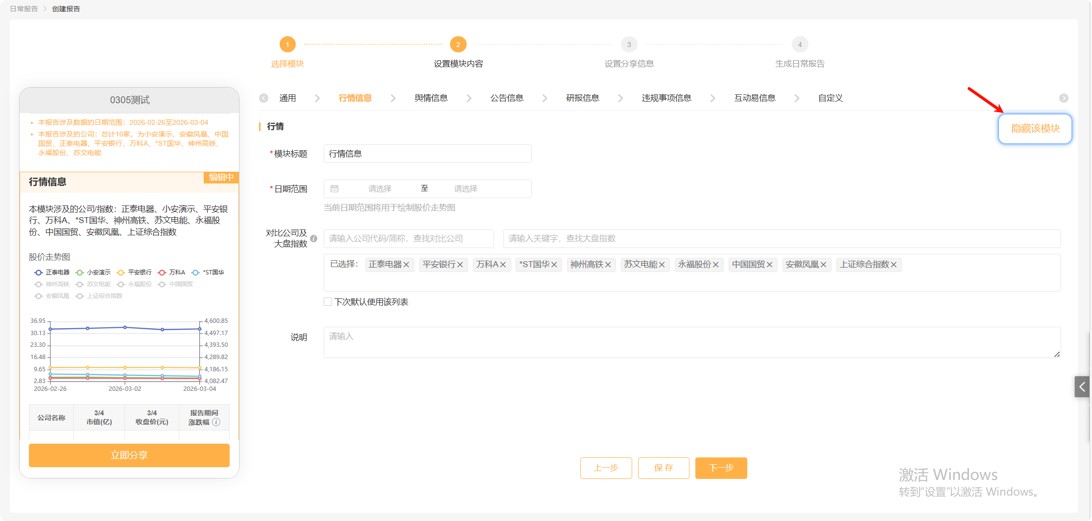 点击下一步,进入“行情信息”模块填写。(填写的流程会根据上一页挑选的模块来展示)