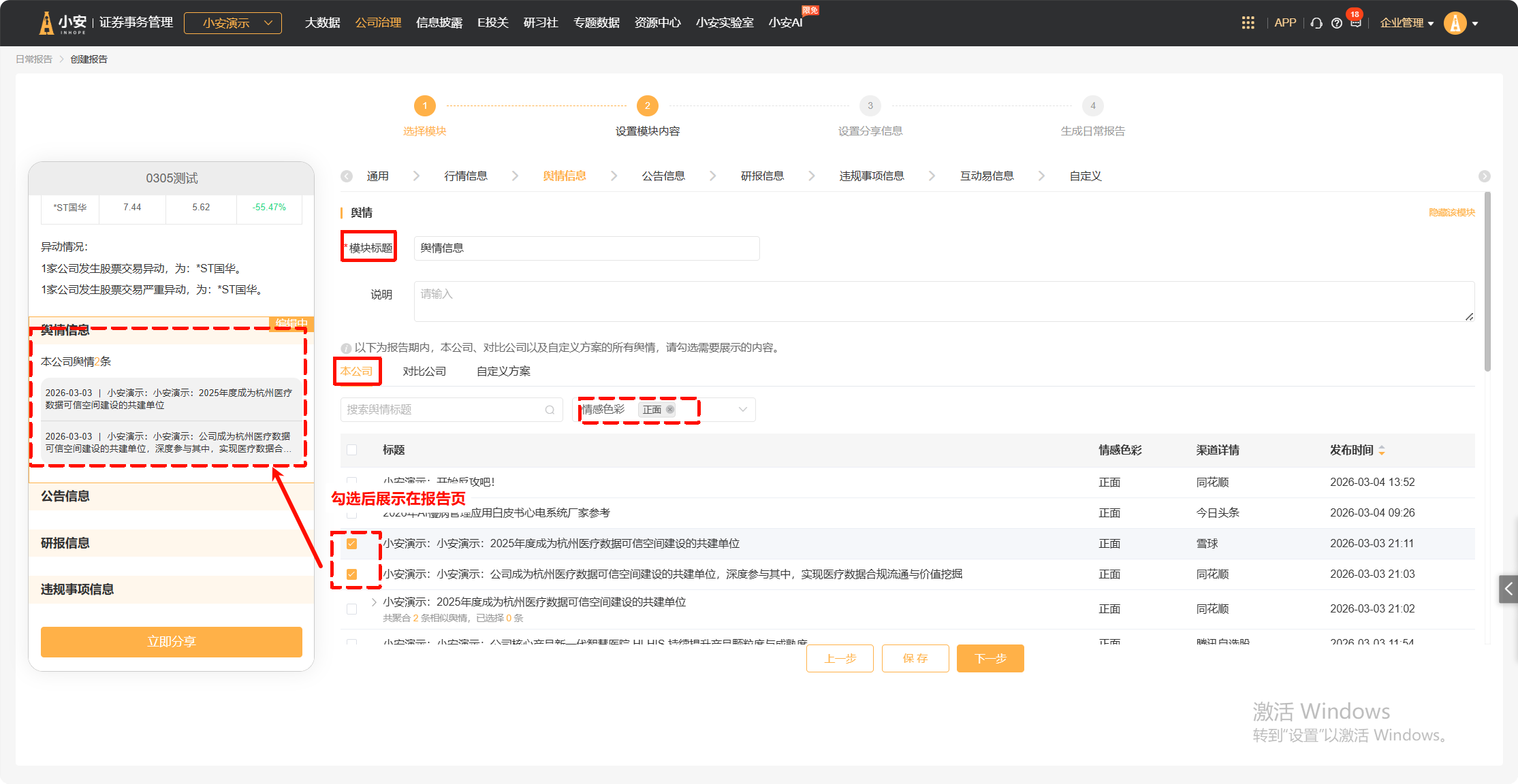 点击下一步进入“舆情信息”,可以修改“模块标题”,搜索“舆情标题”、筛选“舆情色彩”进行查询,挑选需要展示到报告中的舆情信息。