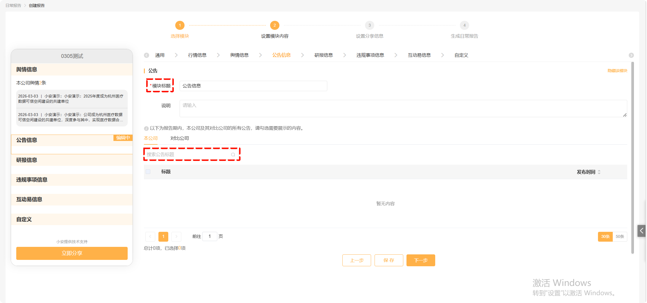 点击下一步进入“公告信息”,可以修改“模块标题”,搜索“公告标题”来查询本公司公告;