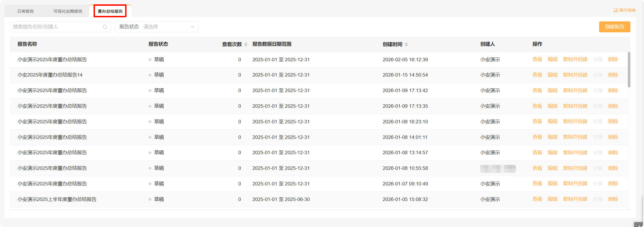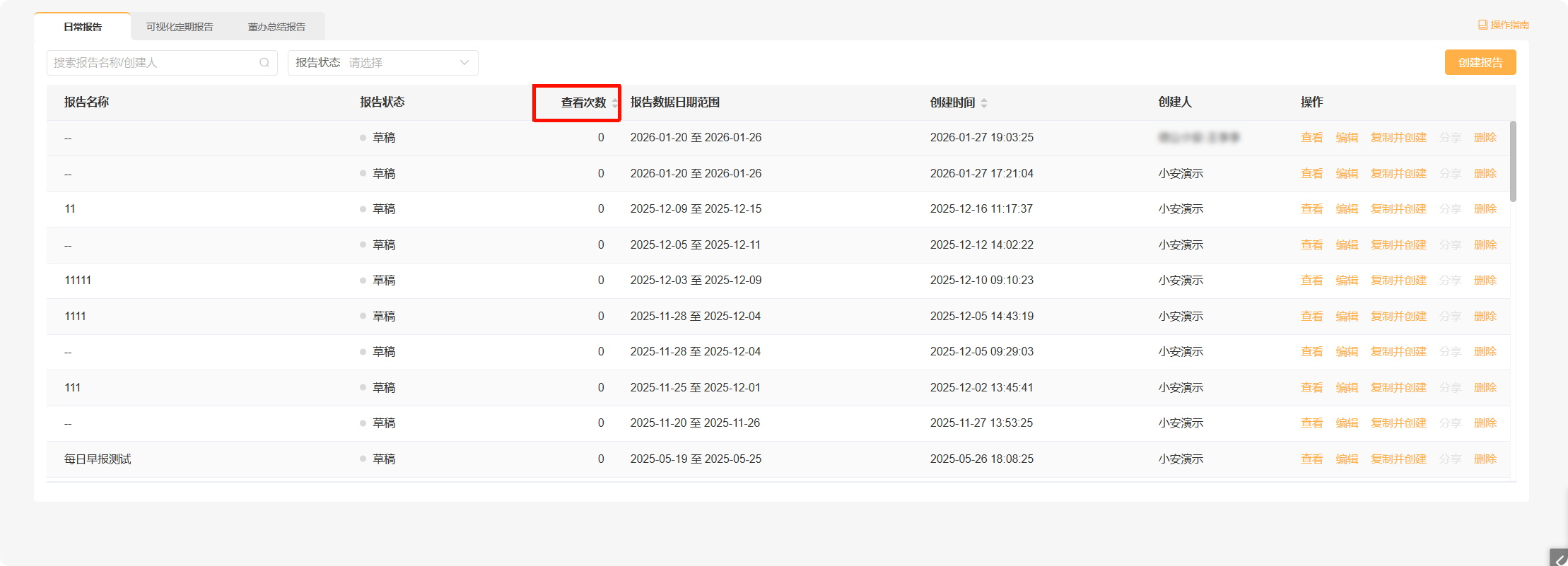 分享后,发起人可以在智能报告列表页面查看到该报告的查看次数。