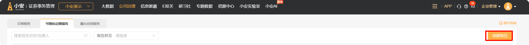 小安的【智能报告】栏目,为您提供智能报告生成工具,支持生成“日常工作报告”、“可视化定期报告”、“董办总结报告”,报告内容支持按需配置,快速高效,解决日常报告需要。