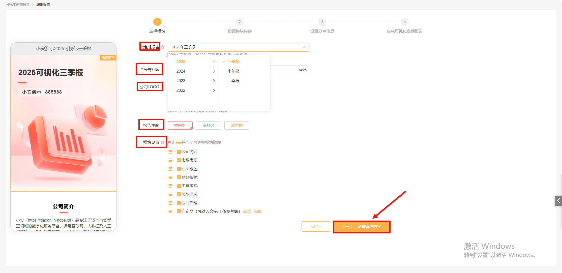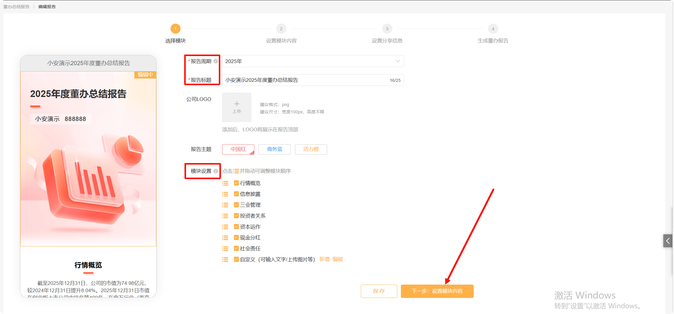 点击“创建报告”,进入董办总结报告创建页面,可以选择报告周期、编辑“标题”、“logo”,选择报告主题以及“模块”内容;