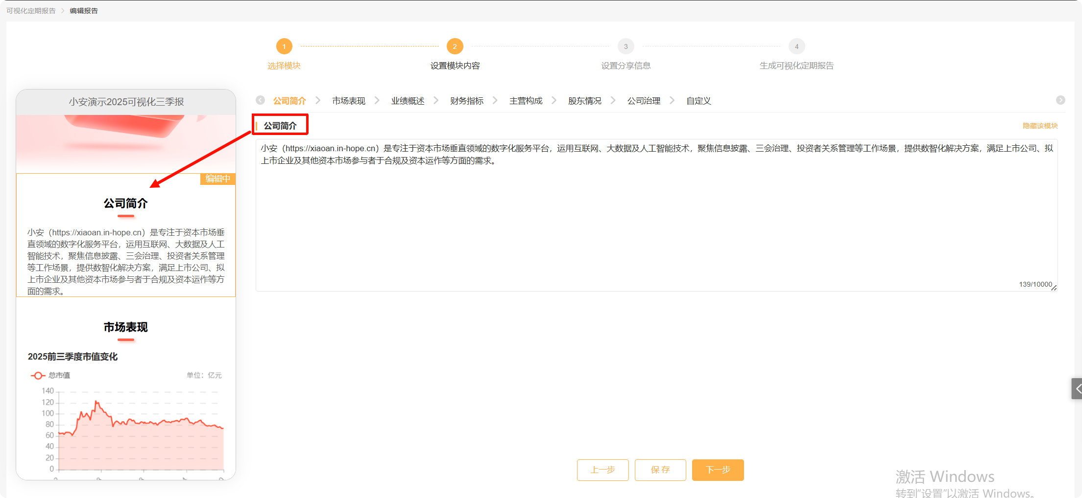 系统将根据公开信息,自动生成“公司简介”“业绩概述”内容,用户可以自行编辑文本内容。