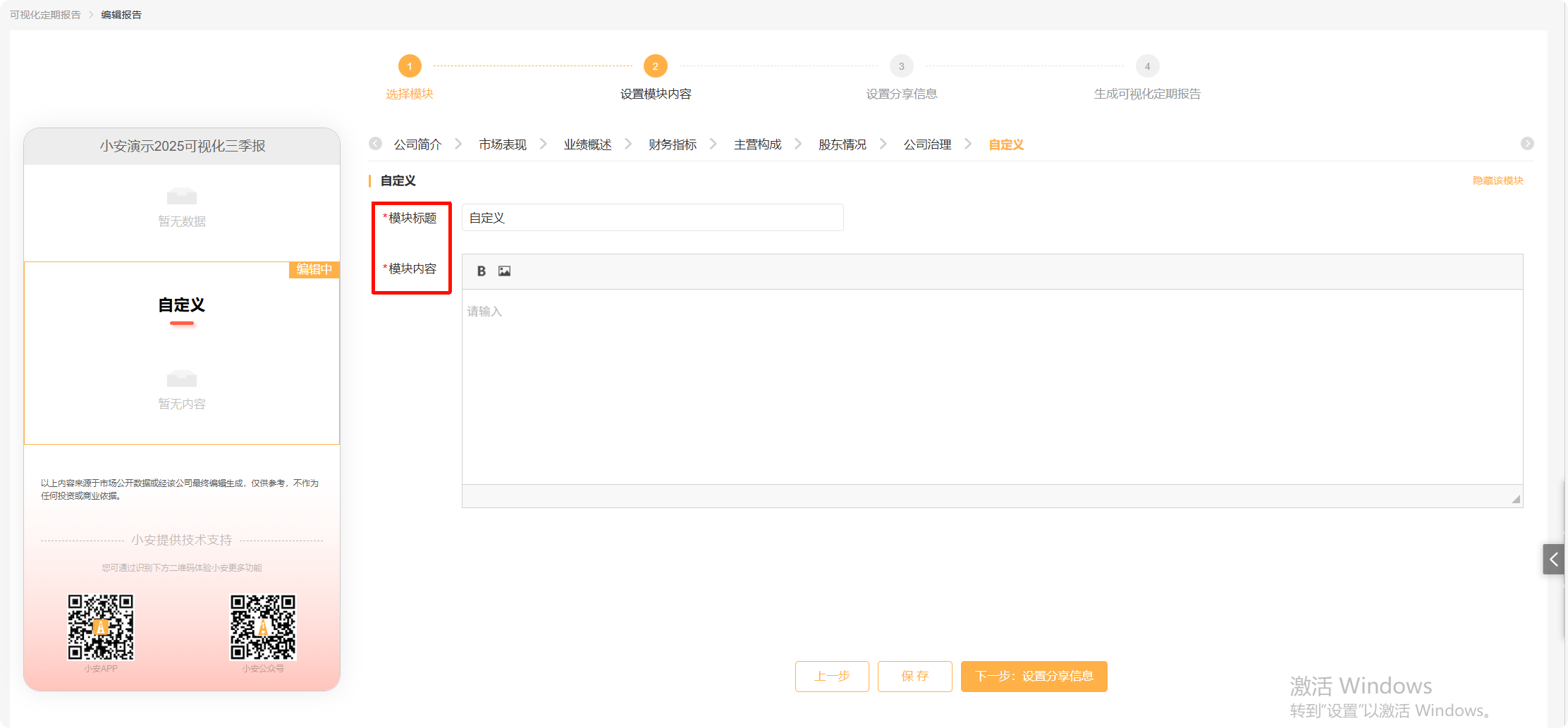 如在智能报告创建页面选择了“自定义”板块,最后可以新增自定义的模块标题和模块内容。