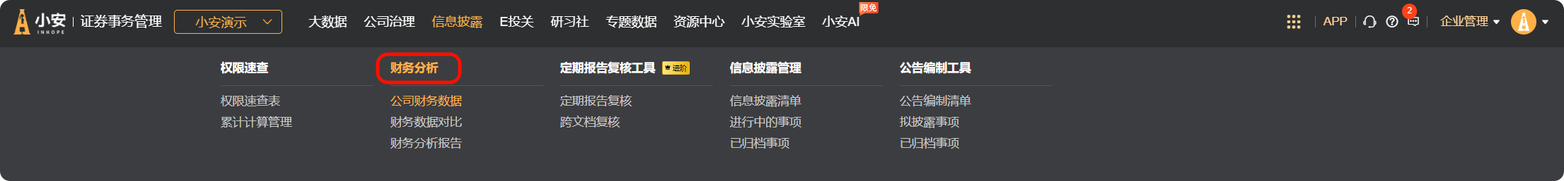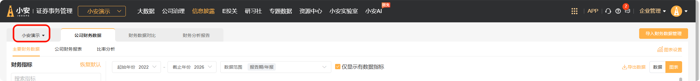 在【信息披露】菜单下,点击【财务分析】,进入公司财务数据页面。