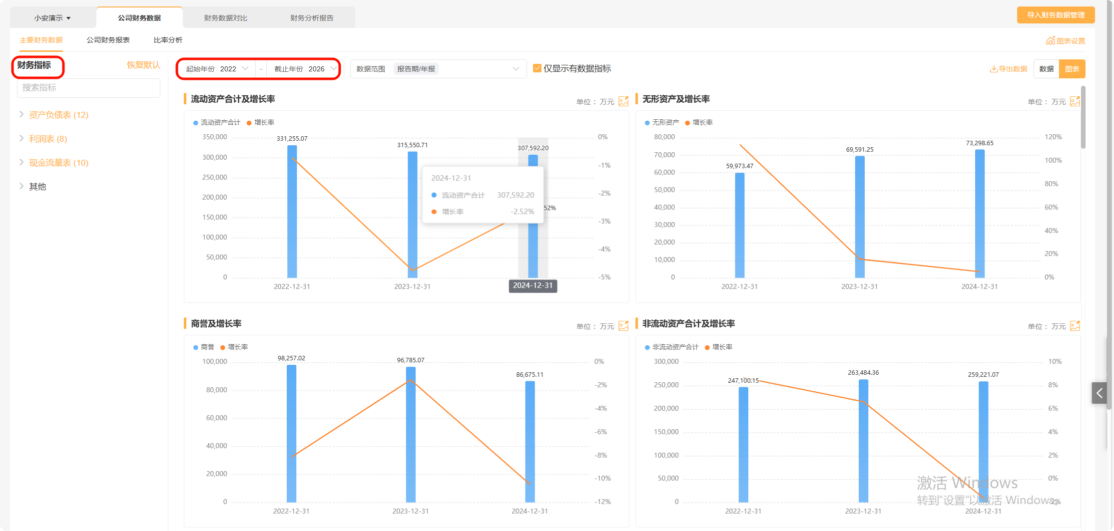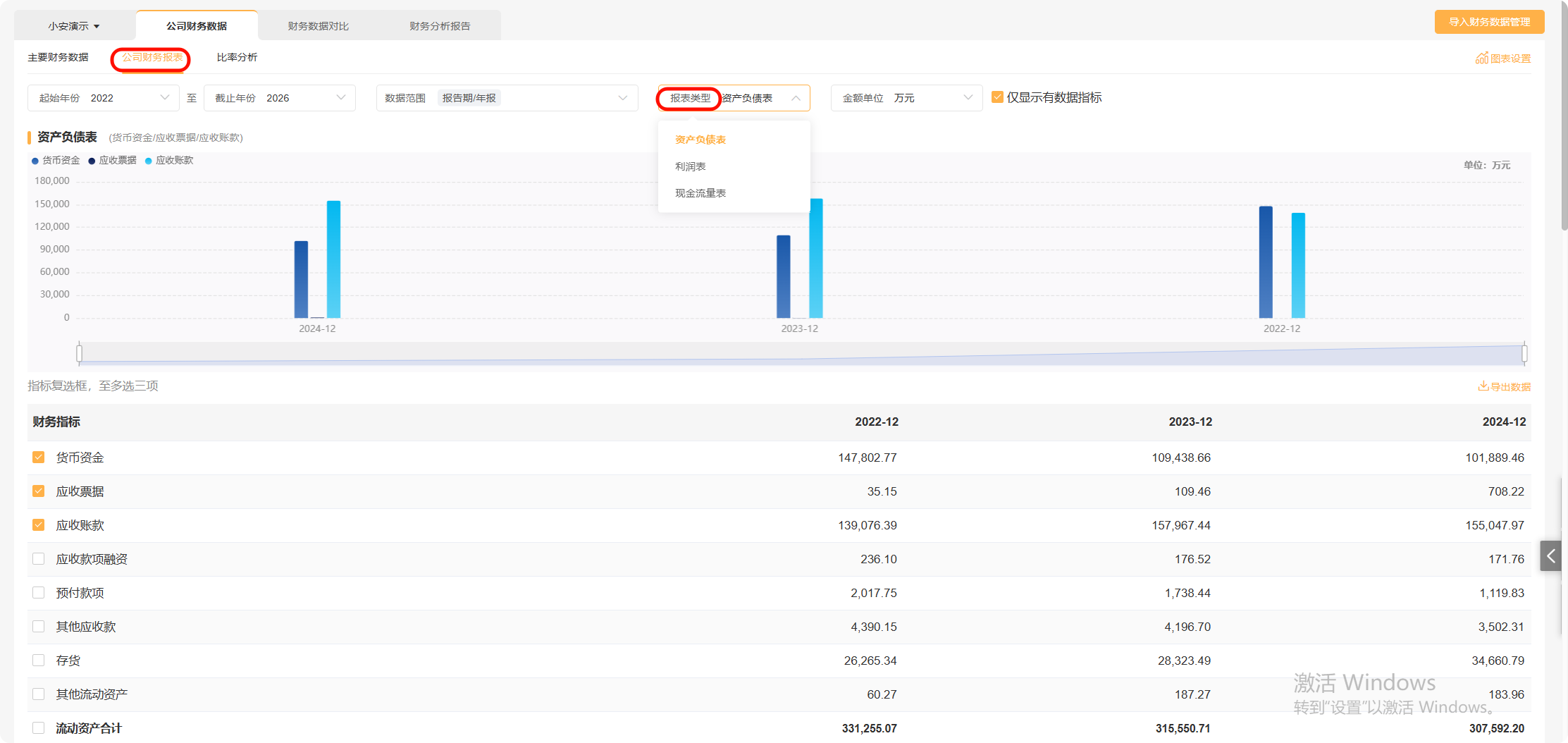 切换至【公司财务报表】模块,通过选择报表类型,查看完成的财务报表。勾选指标后,系统将通过柱状图进行数据展示。
