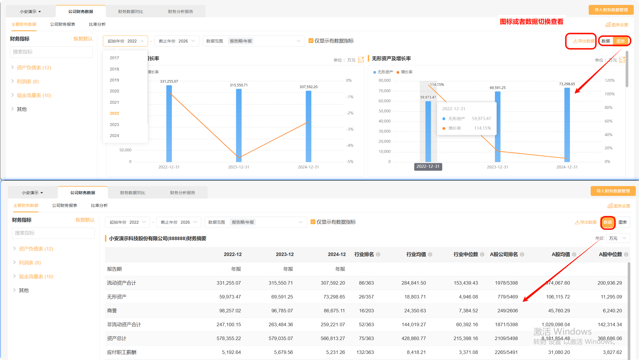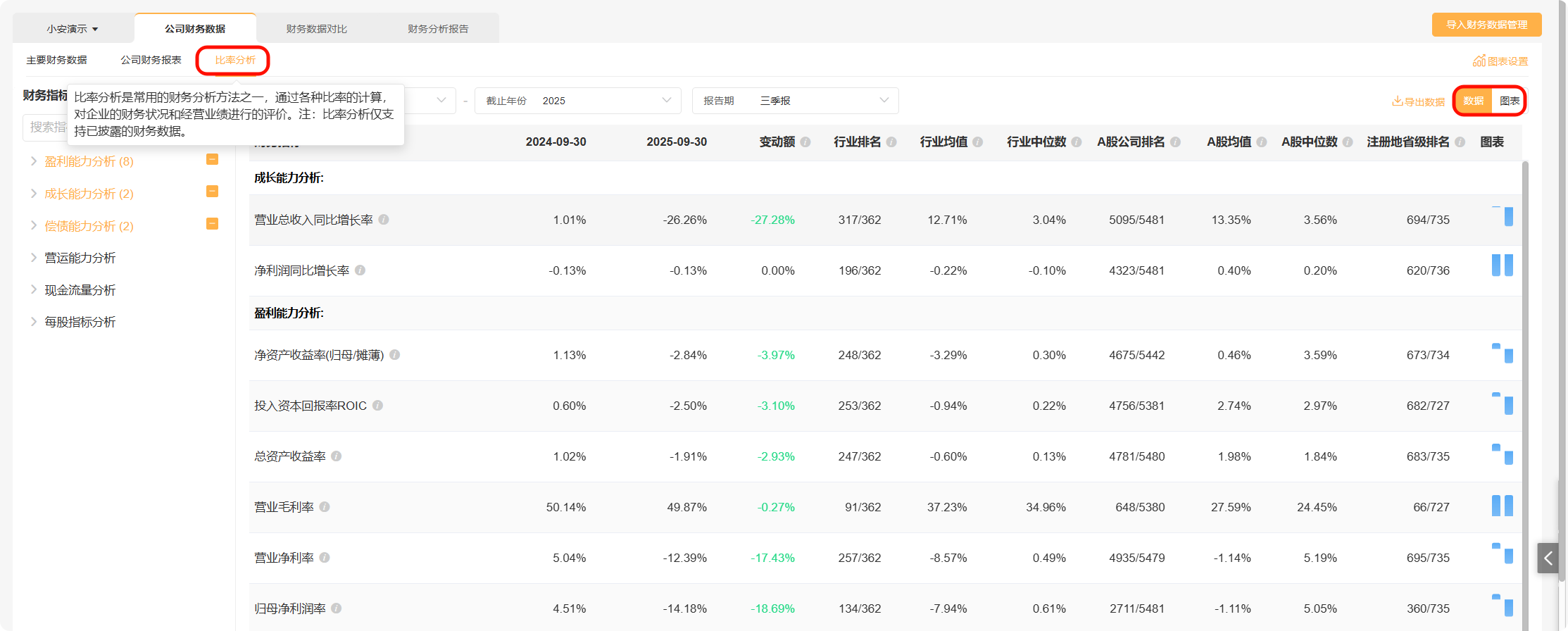 在“比率分析”页面,系统提供了系列比率分析指标,支持通过数据或图表形式进行分析和下载。