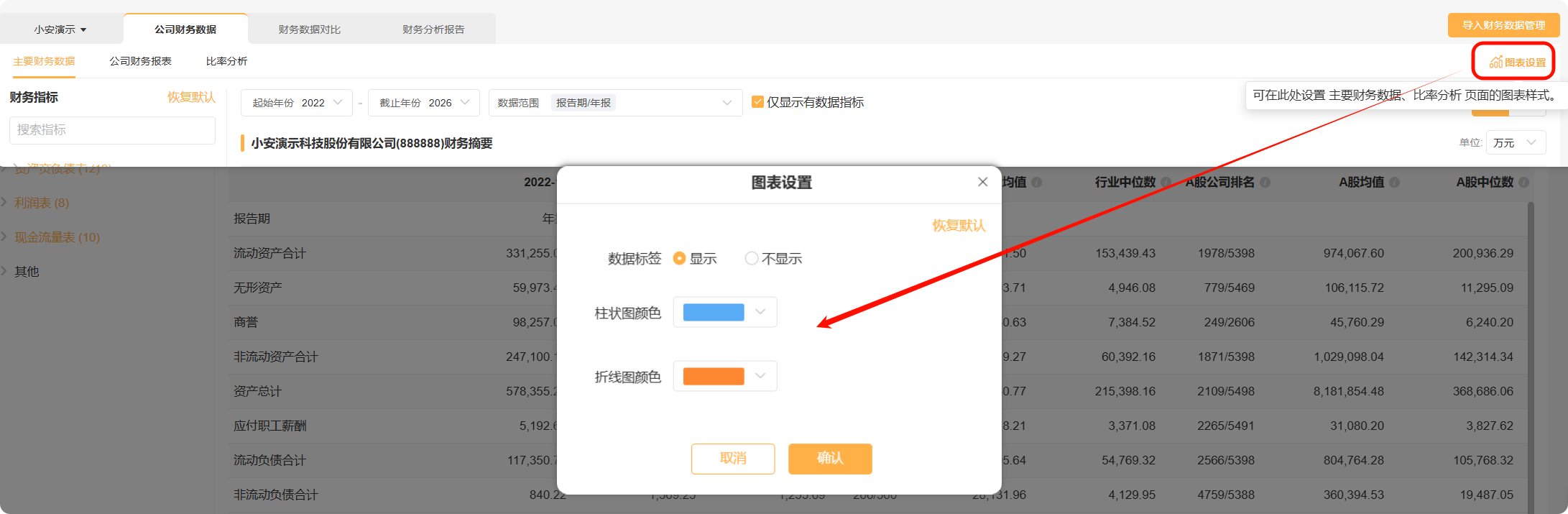 点击“图表设置”,支持对图表色系以及是否显示数据标签等内容进行设置。