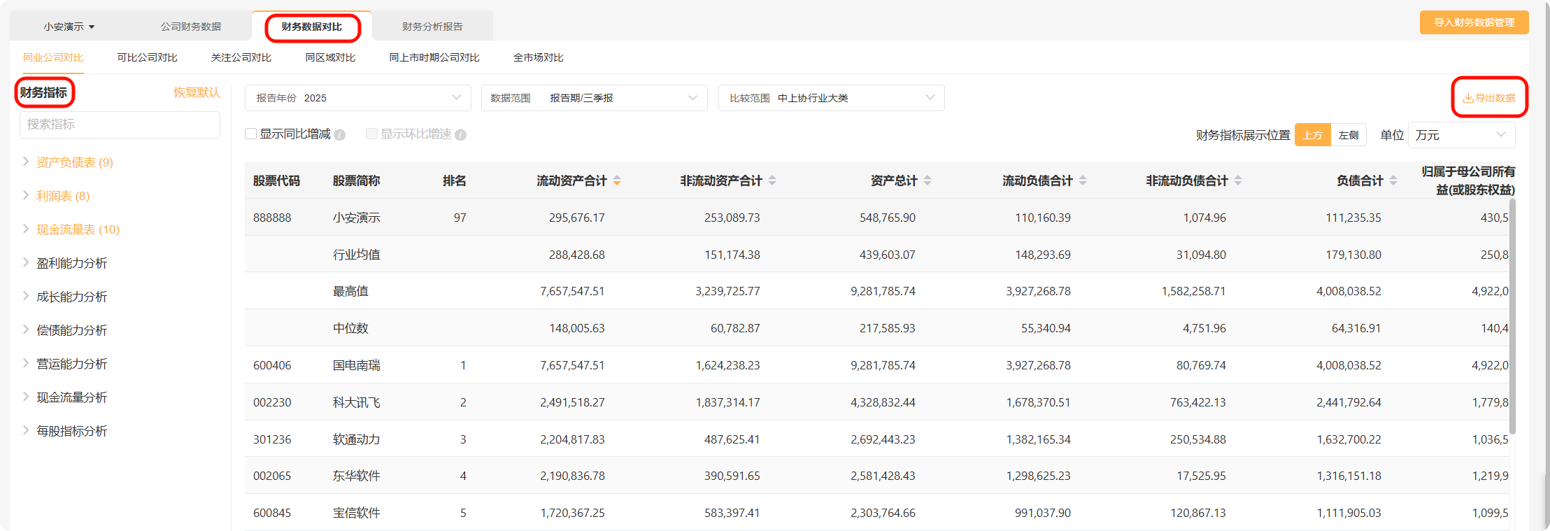 除了分析本公司财务数据,系统还支持财务数据对比。点击【财务数据对比】,在左侧选择想要比较分析的财务指标。