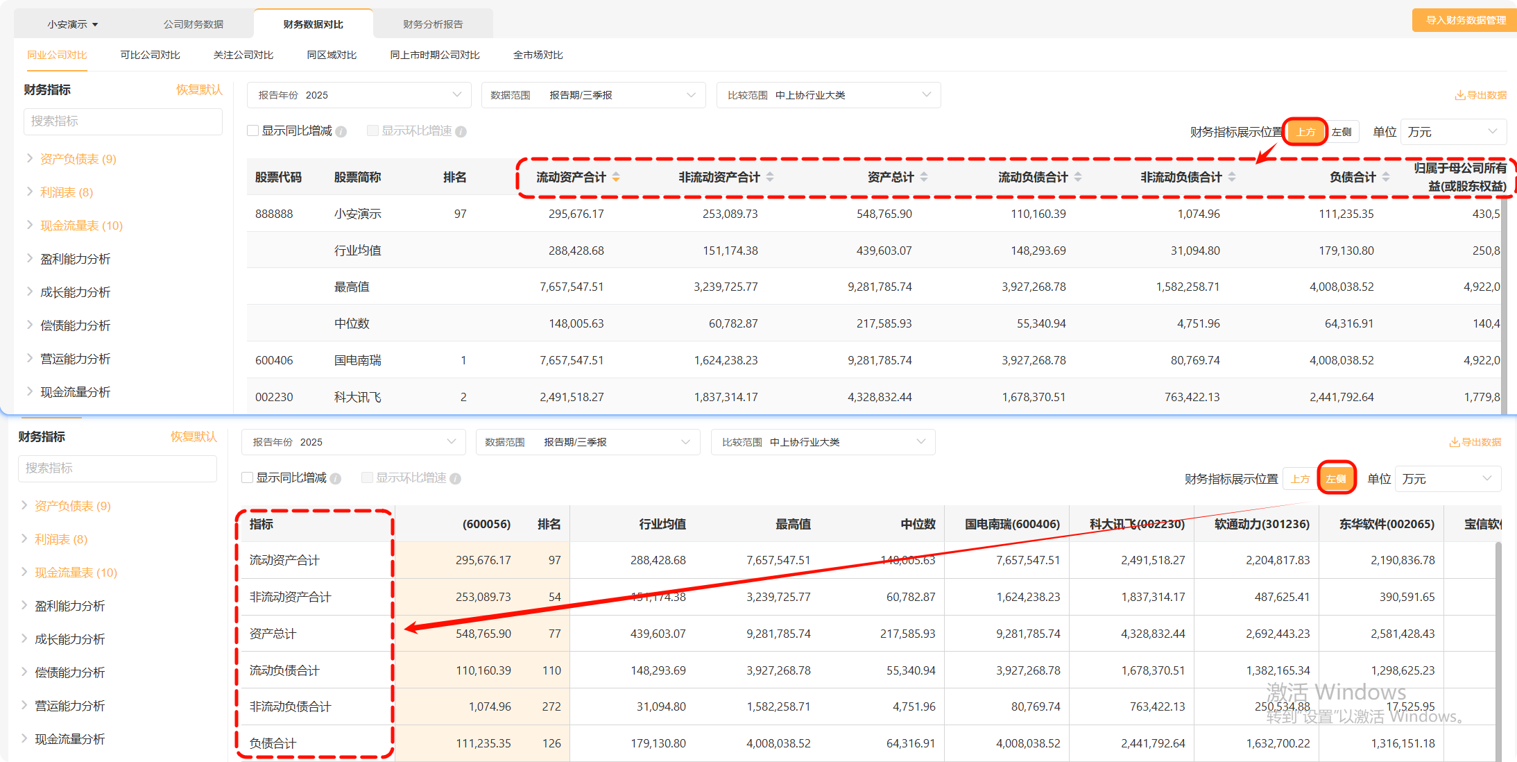 财务指标的展示可以根据习惯切换选择显示在上方还是左侧