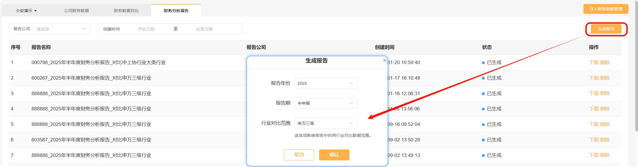 在【财务分析报告】模块,点击“生成报告”按钮,即可选择报告年份与报告期并快速生成对应的财务分析报告。