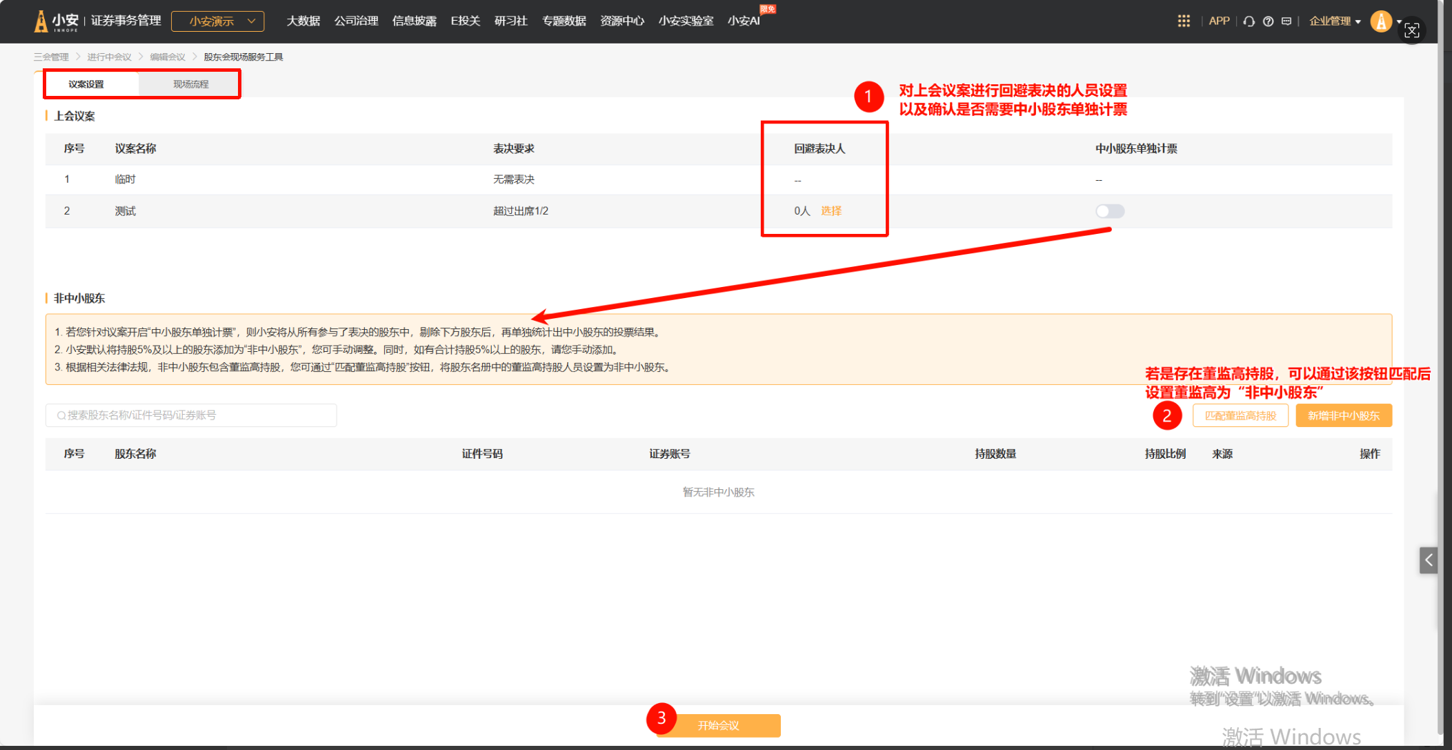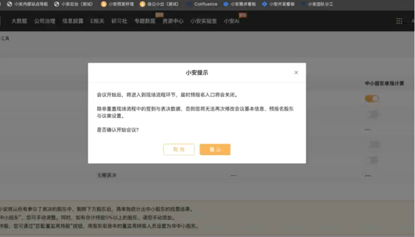 2.上会会议列表支持通过开关,切换是否开启中小股东单独计票(若开启,则会在现场流程的表决统计中,将中小股东的数据单独进行统计展示);