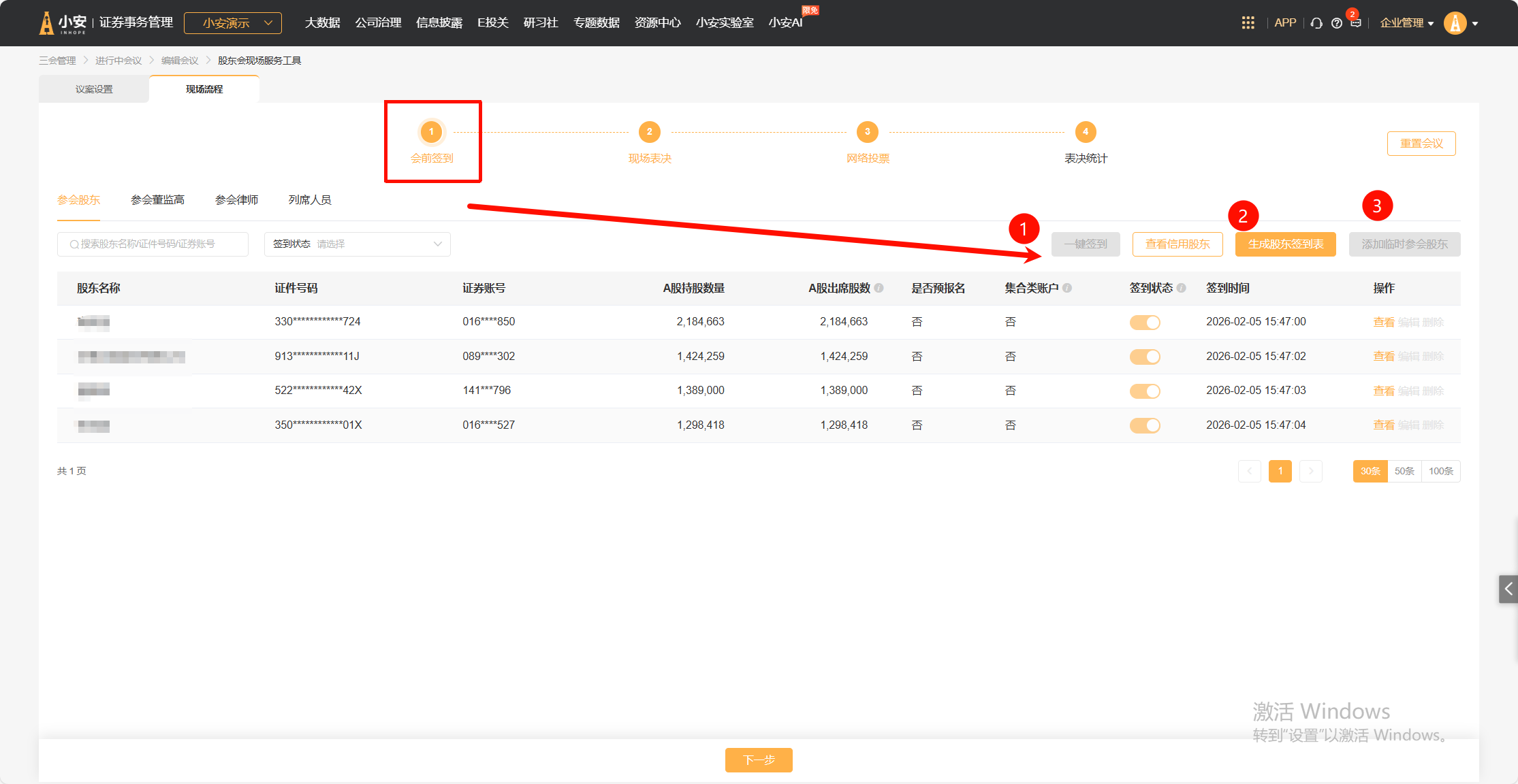 a.支持通过点击“一键签到”按钮,将所有未签到股东状态修改为已签到,列表可以查看/编辑/删除股东信息;