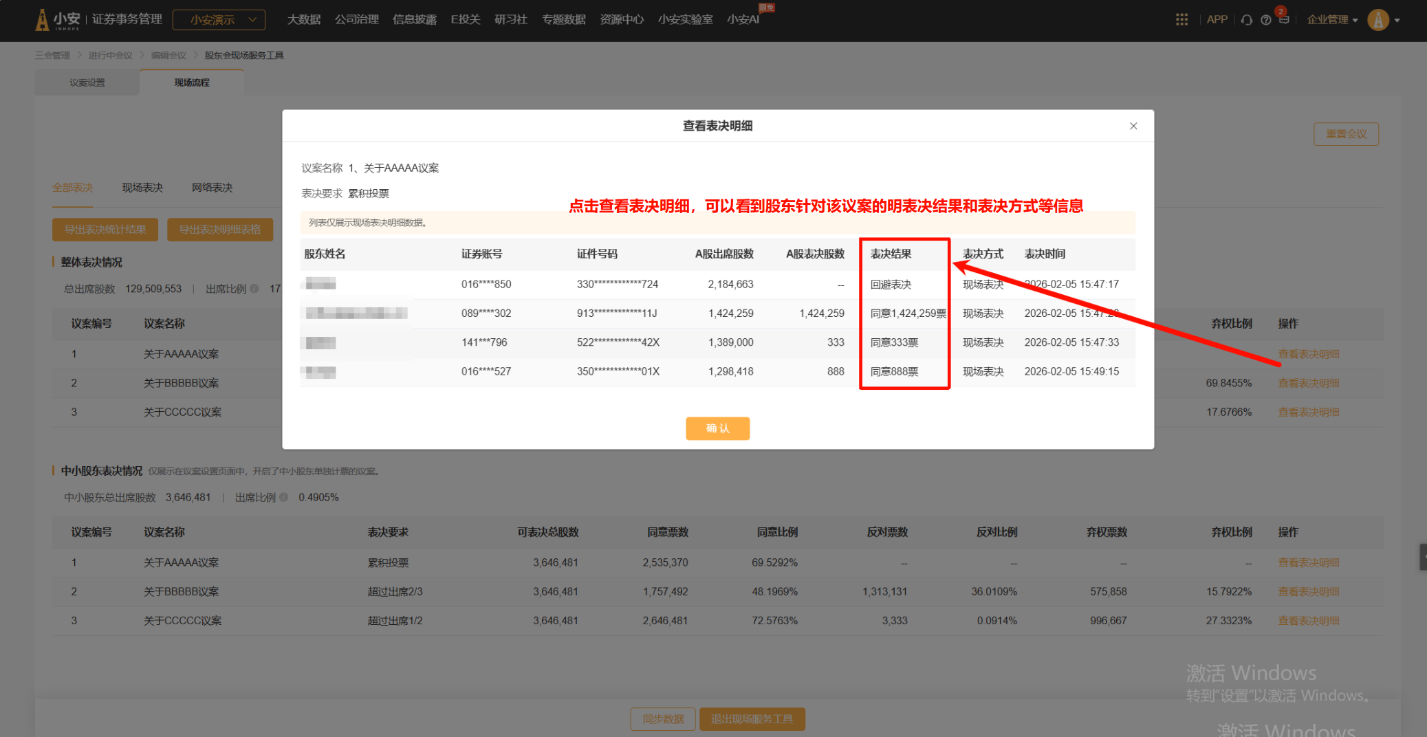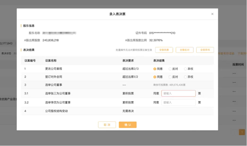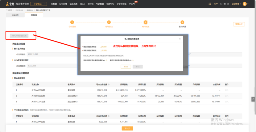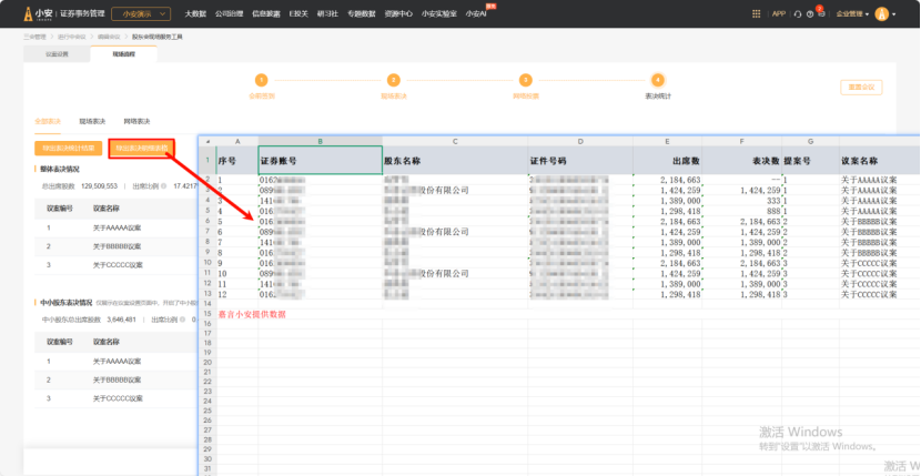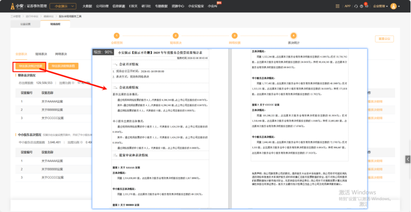 自动计算全部表决、现场表决、网络表决三个维度的最终投票结果,对应展示整体表决和中小股东表决情况;模块下支持导出具体议案的表决结果和明细表格使用。