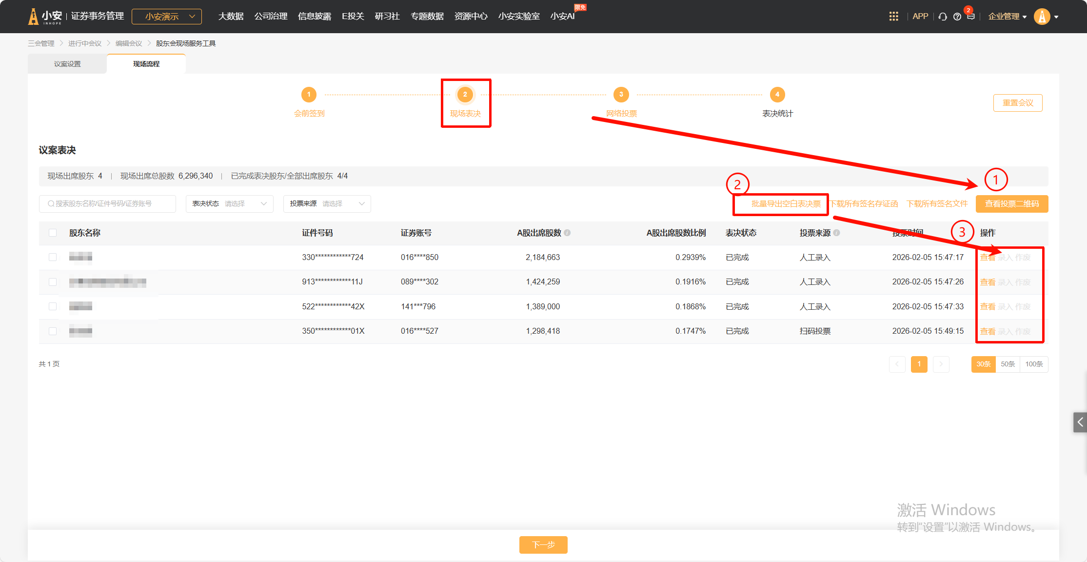 可以通过设置投票二维码在手机端参与议案表决;“导出空白表决票”可以下载word文件打印后现场参与表决填写,之后根据表决文件录入表决信息;