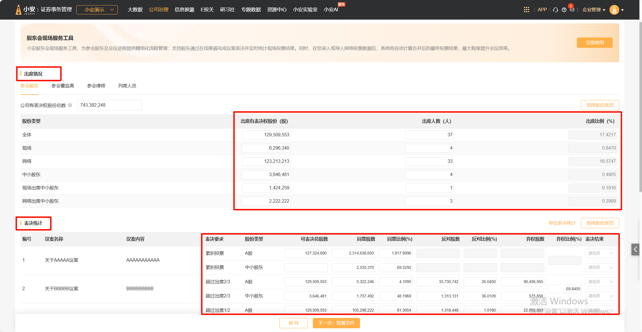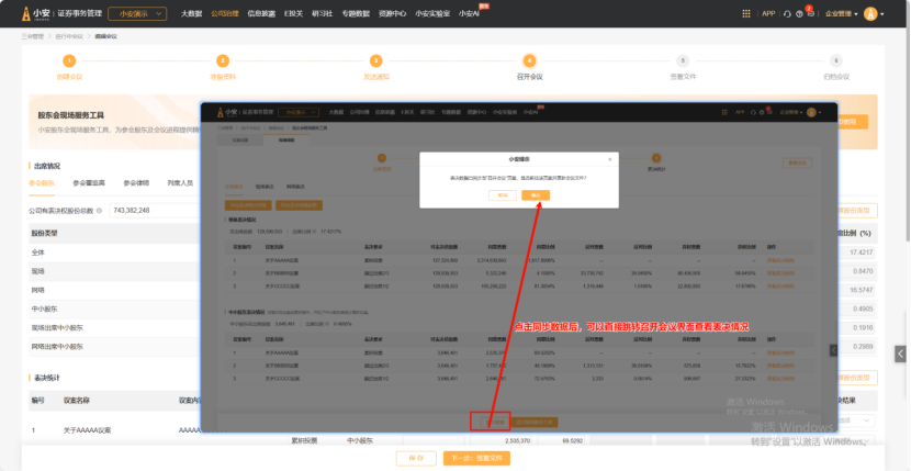 5.点击同步数据,会将现场流程中的表决数据同步到“召开会议”界面,高效实现股东会表决统计和出席情况的整理。