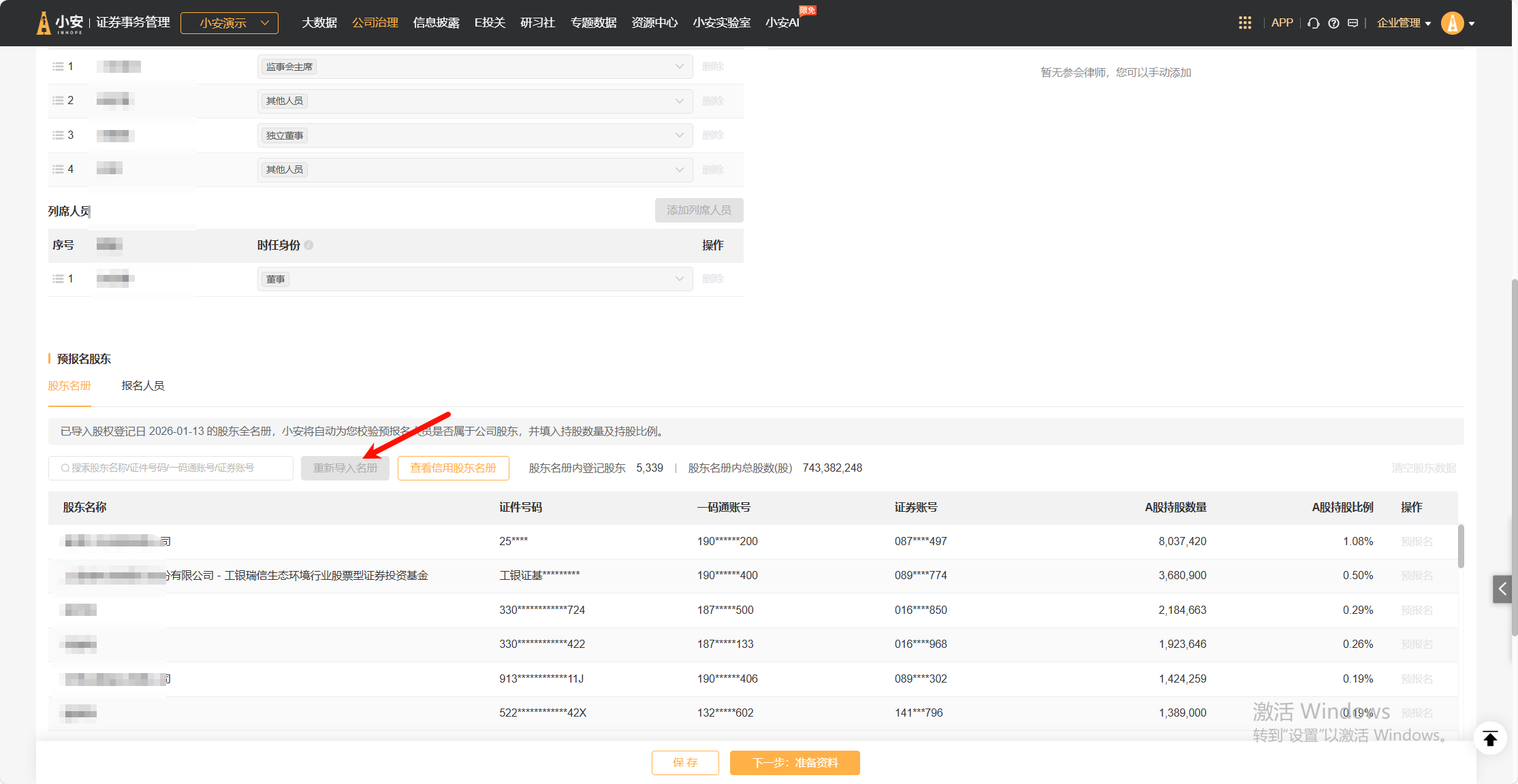 进入该页面时,列表会默认将股东名册中持股5%及以上的股东添加至“非中小股东”列表中