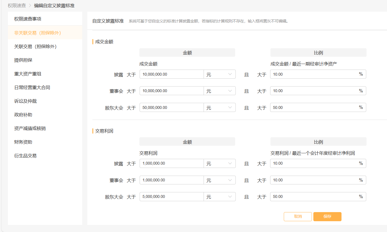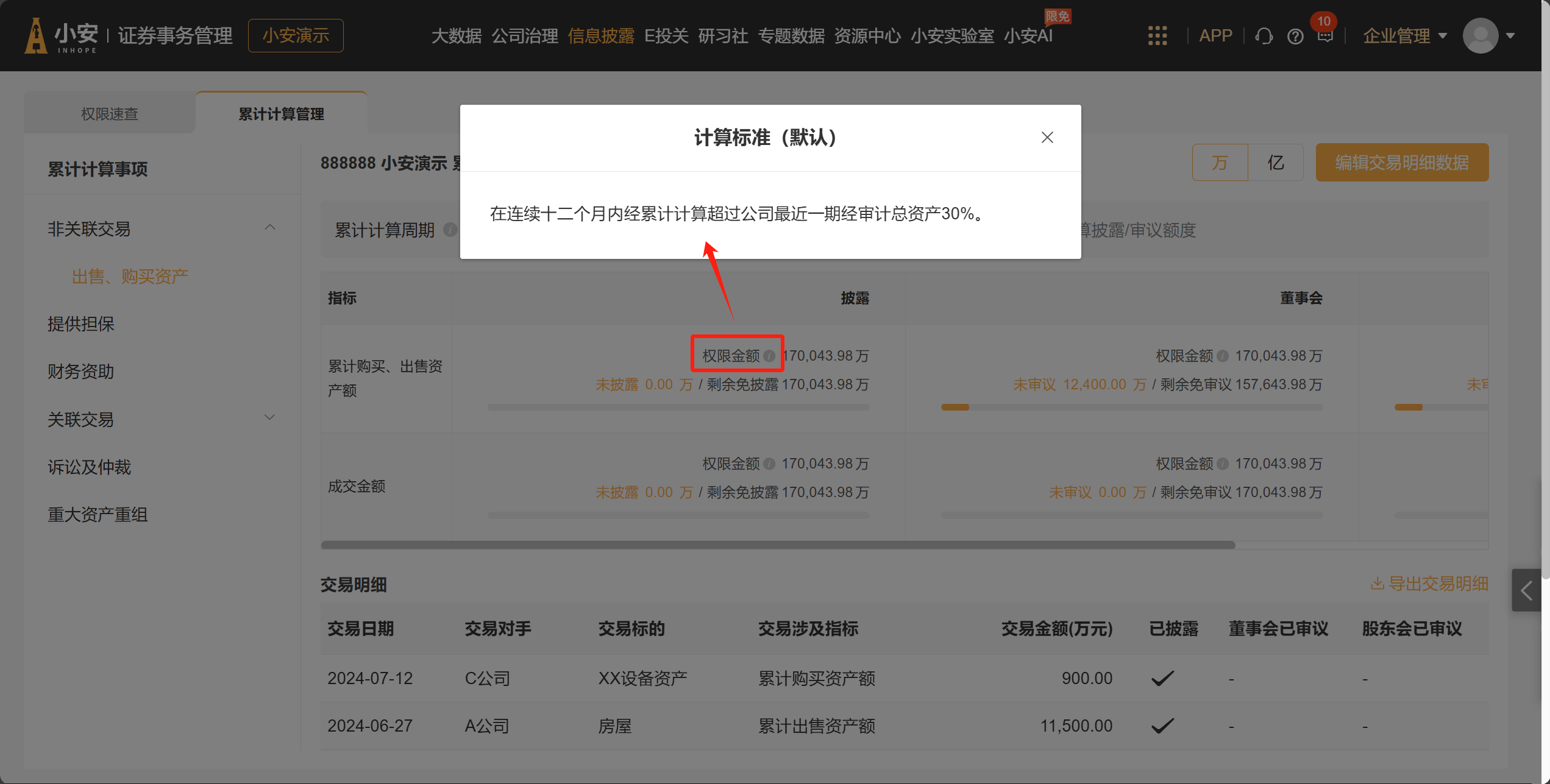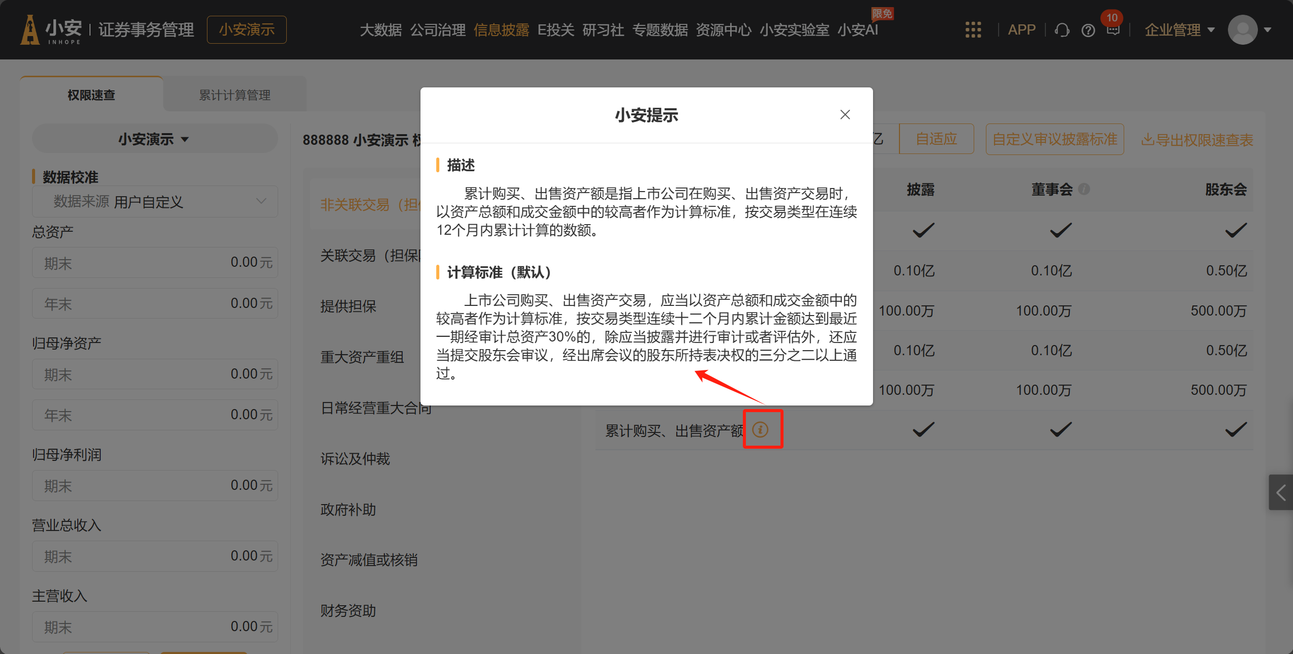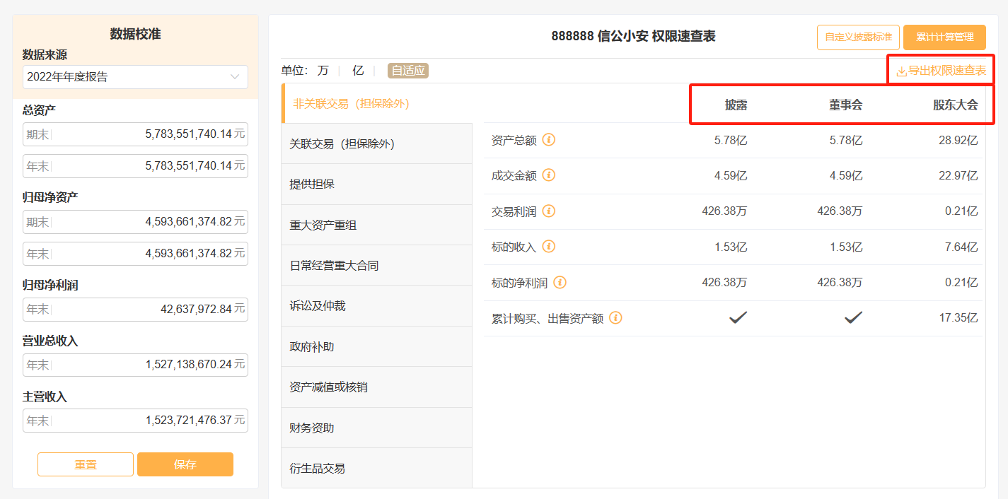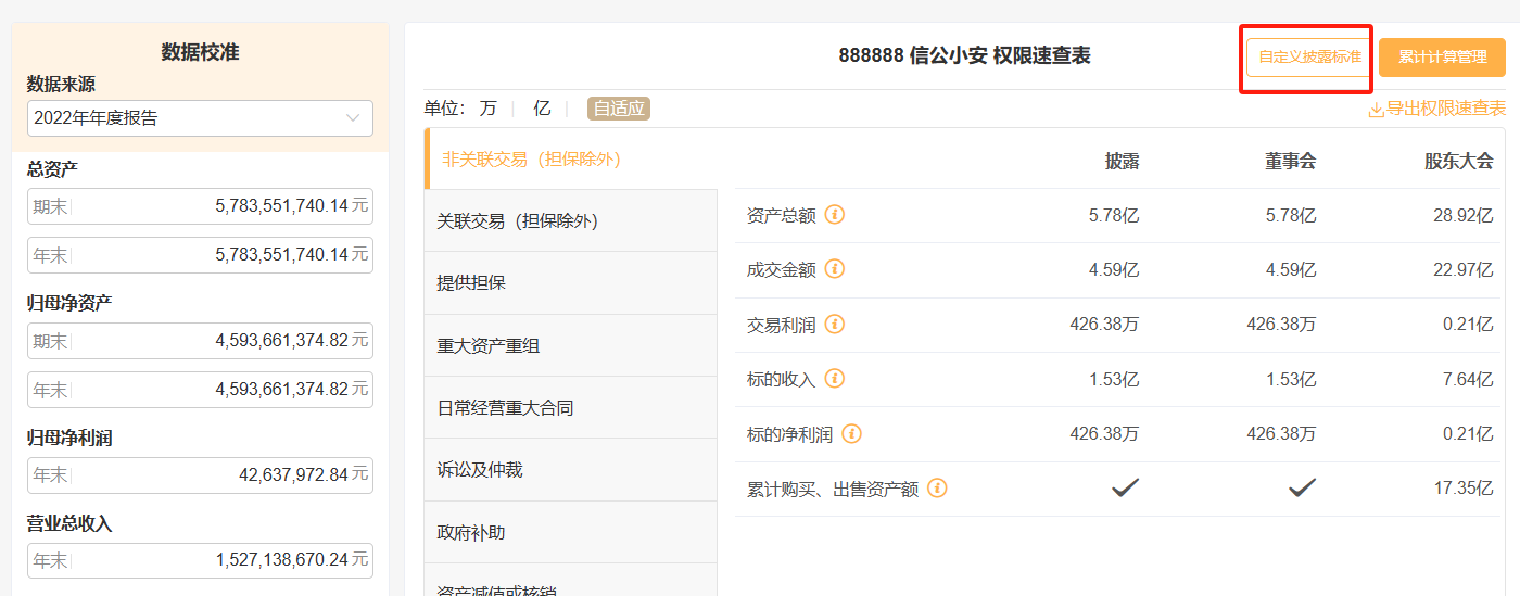 小安的【权限速查】栏目,小安根据上市公司经审计财务数据,结合最新的法律法规,自动为上市公司计算出各个事项的披露和提交股东大会标准