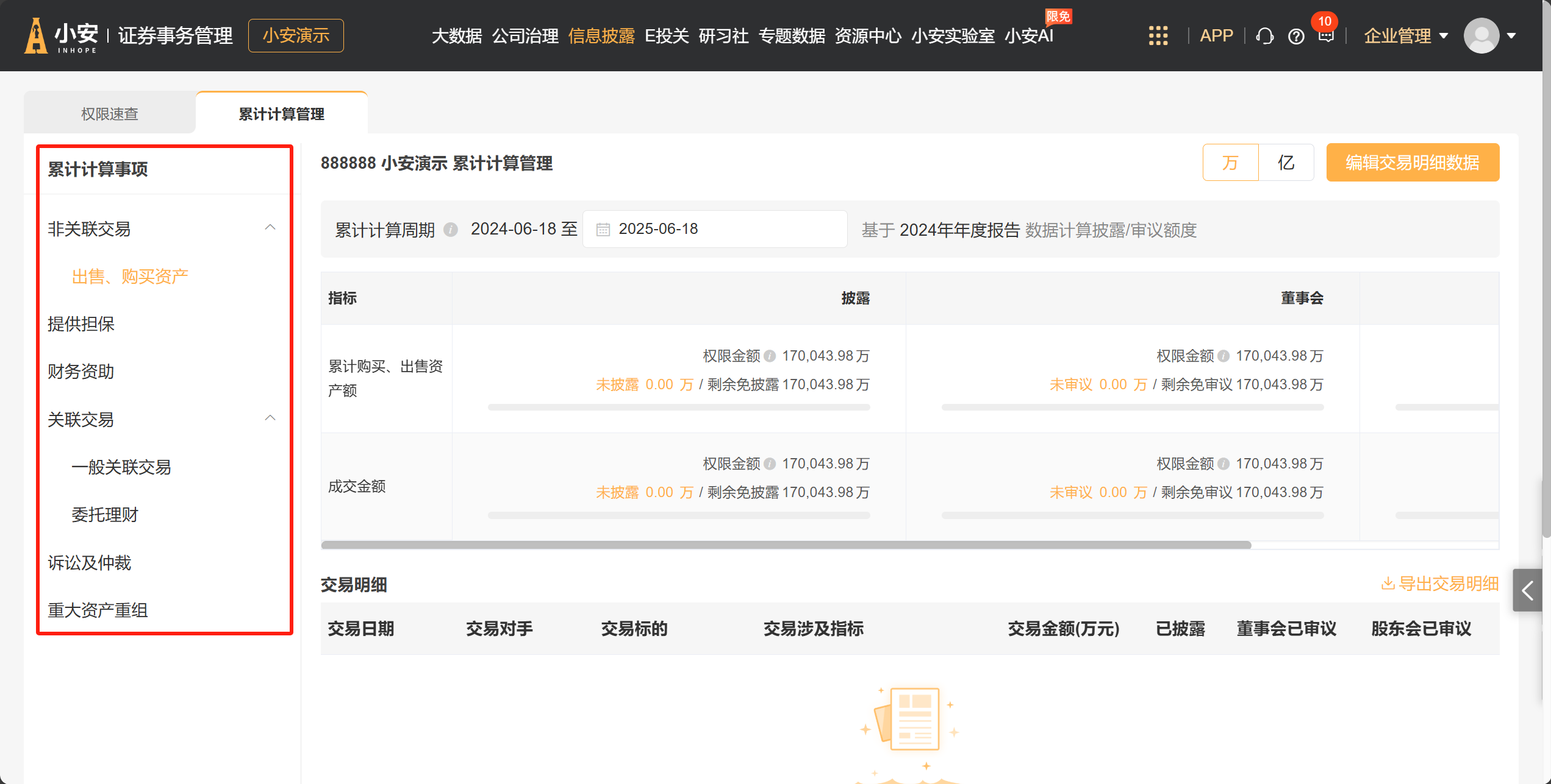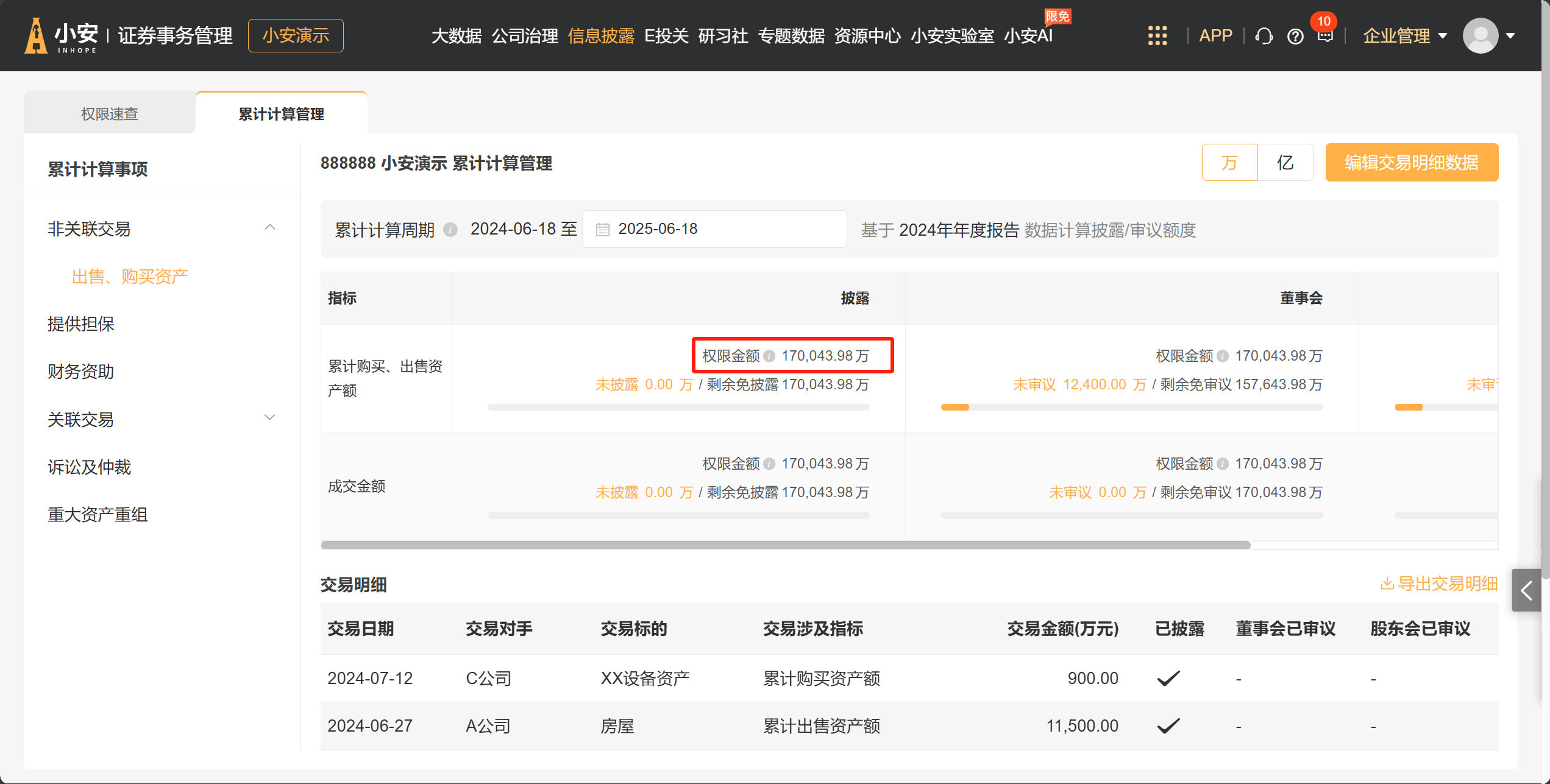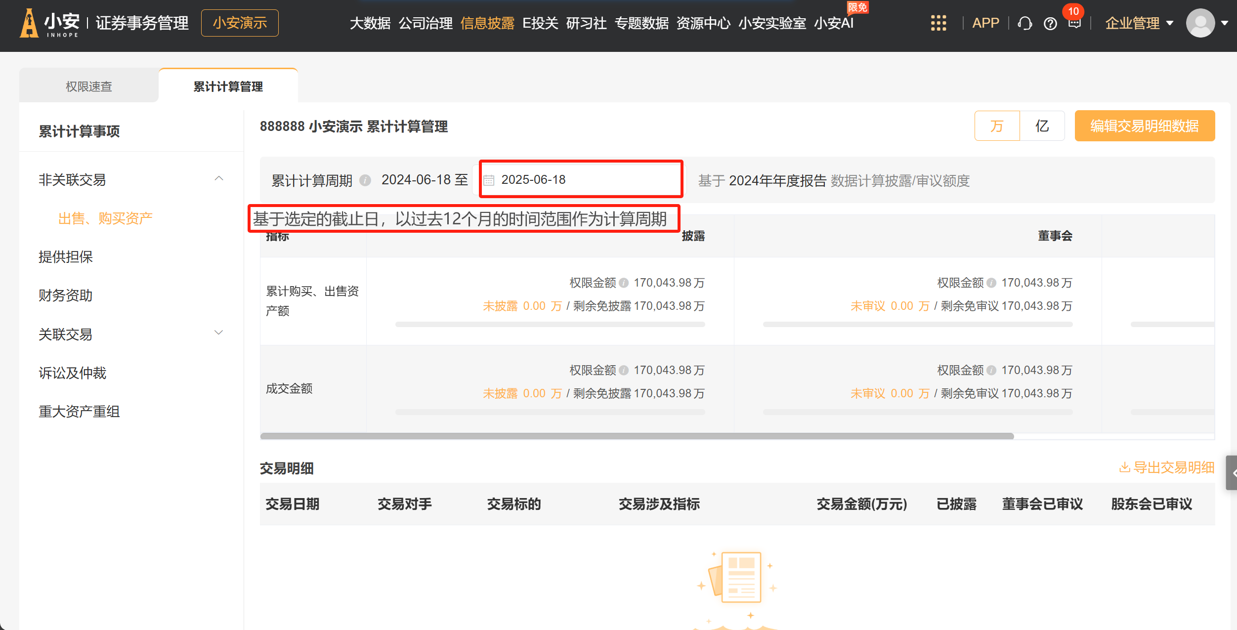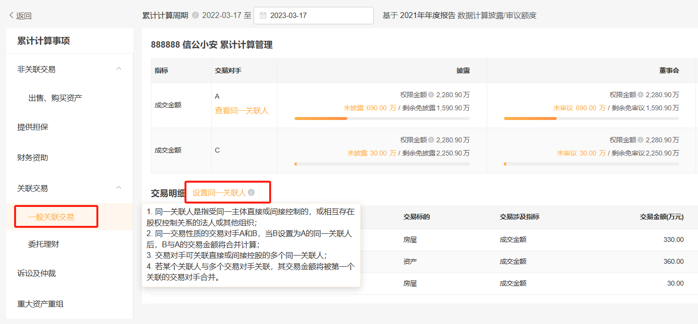 针对一般关联交易,支持设置同一关联人,系统将合并同一关联人的交易记录进行累计计算。