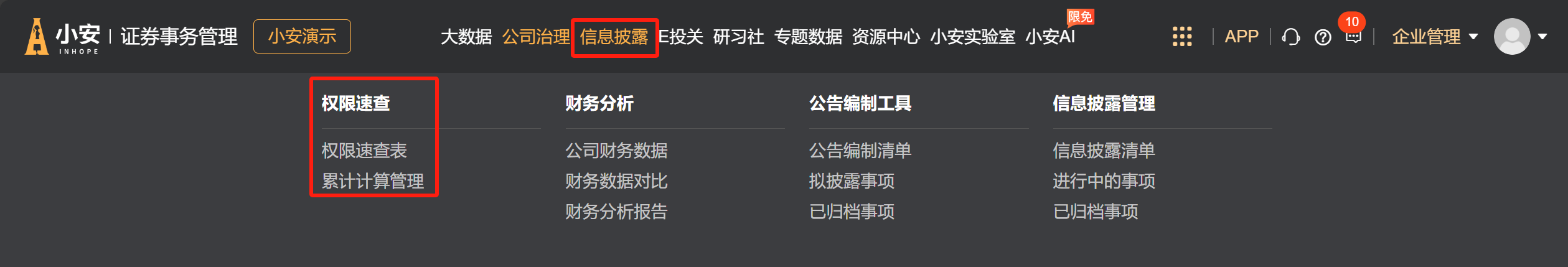 在【信息披露】菜单下,点击【权限速查】,进入权限速查表。