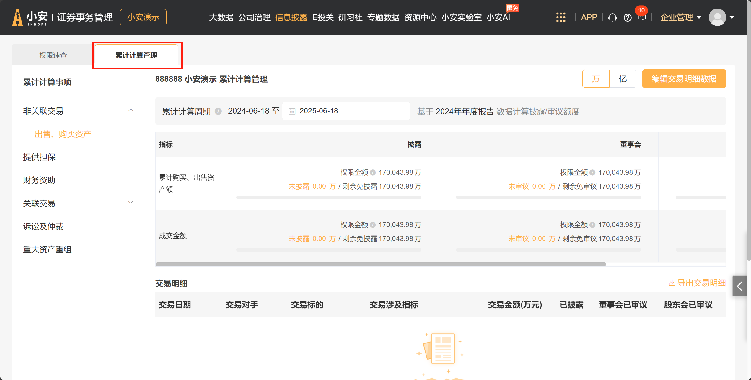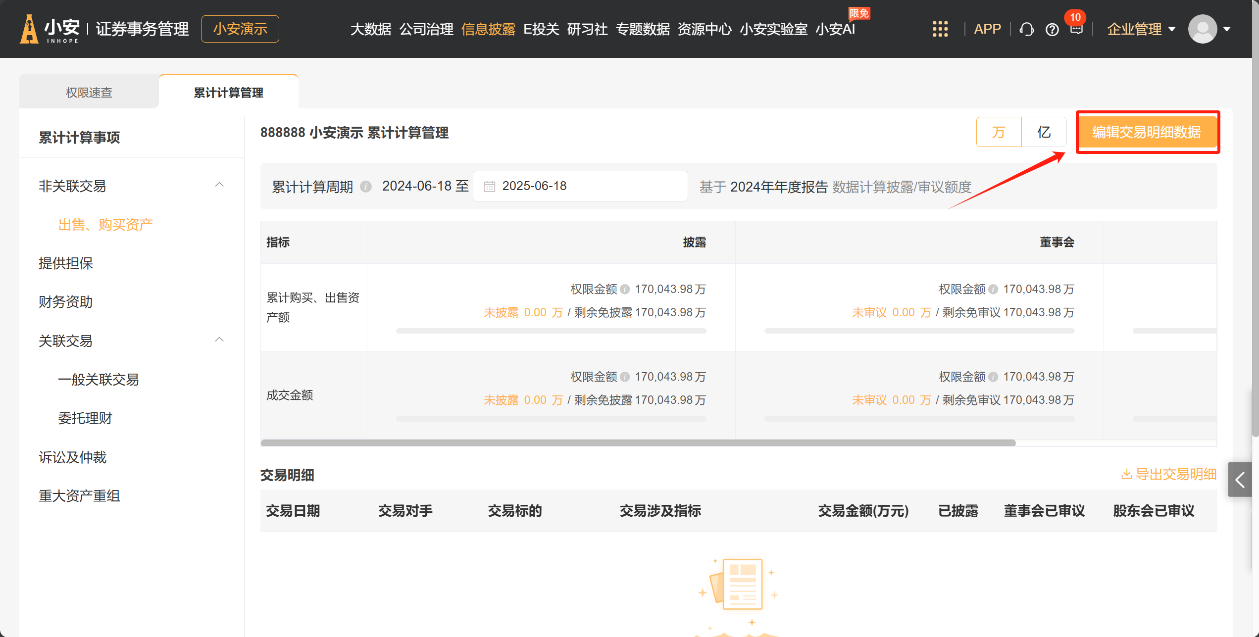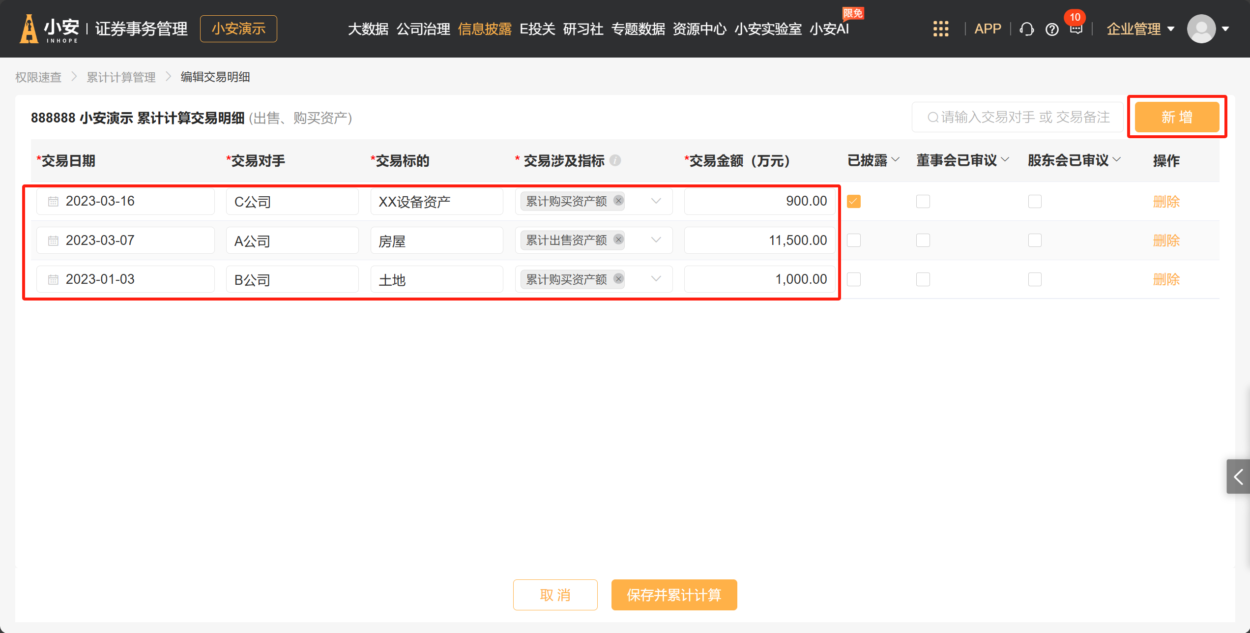填写数据保存后,未披露/剩余免披露,未审议/剩余免审议金额,会根据交易明细自动更新;