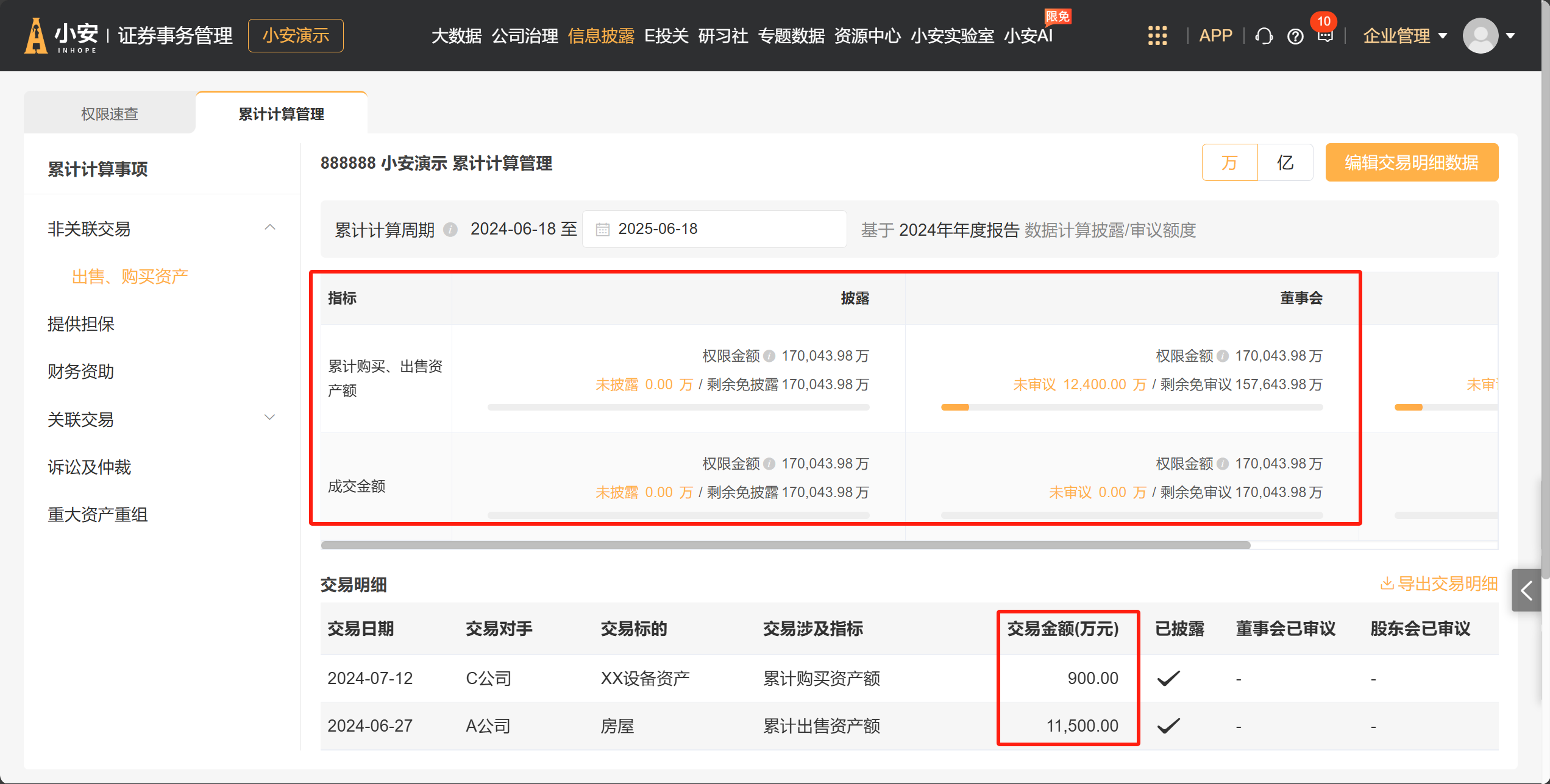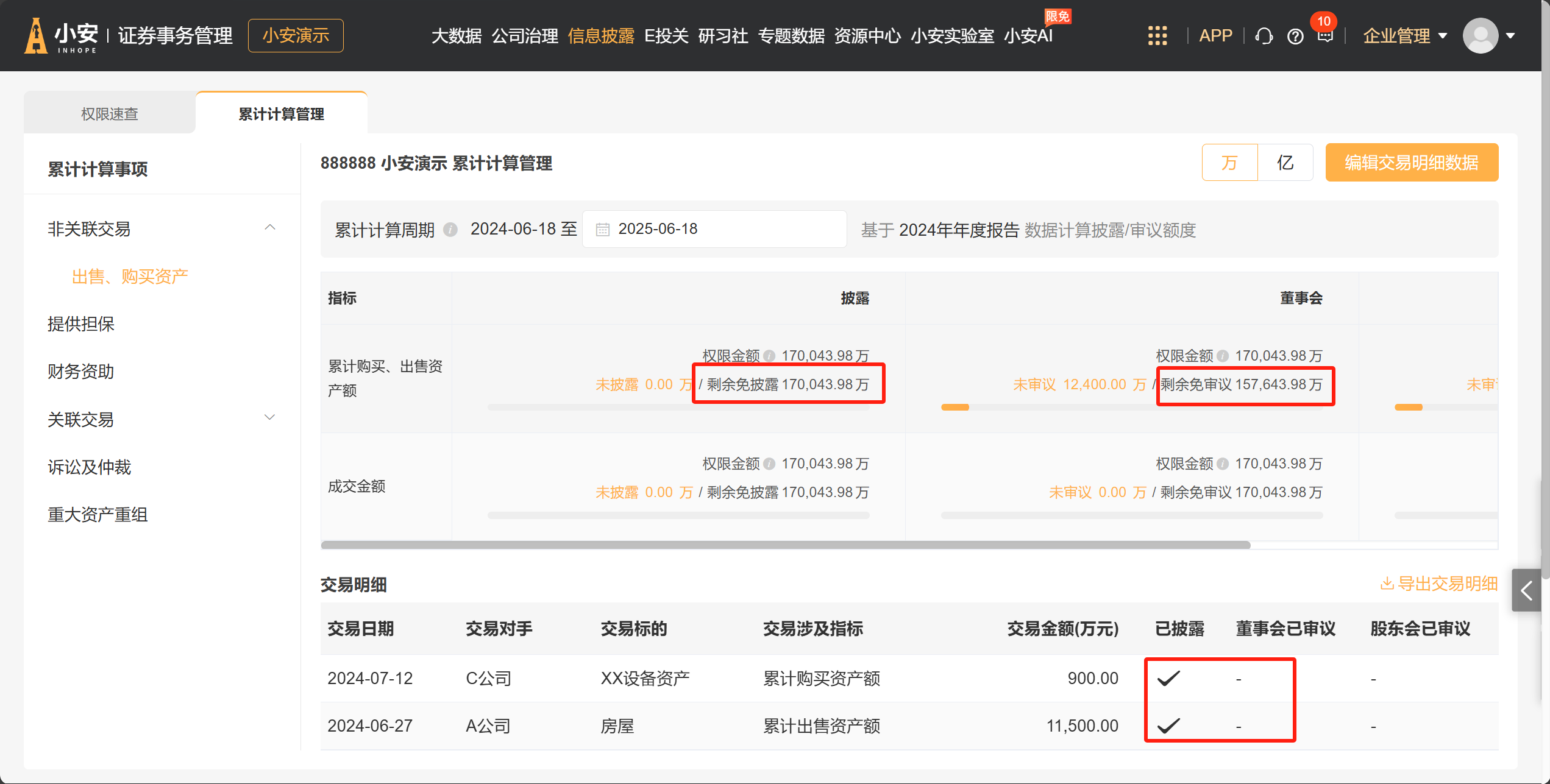如果在累计计算的时间区间里某项交易已进行披露或经审议,需要在披露/审议处打勾,这样在剩余免披露金额和剩余免审议处,会自动剔除这笔交易金额
