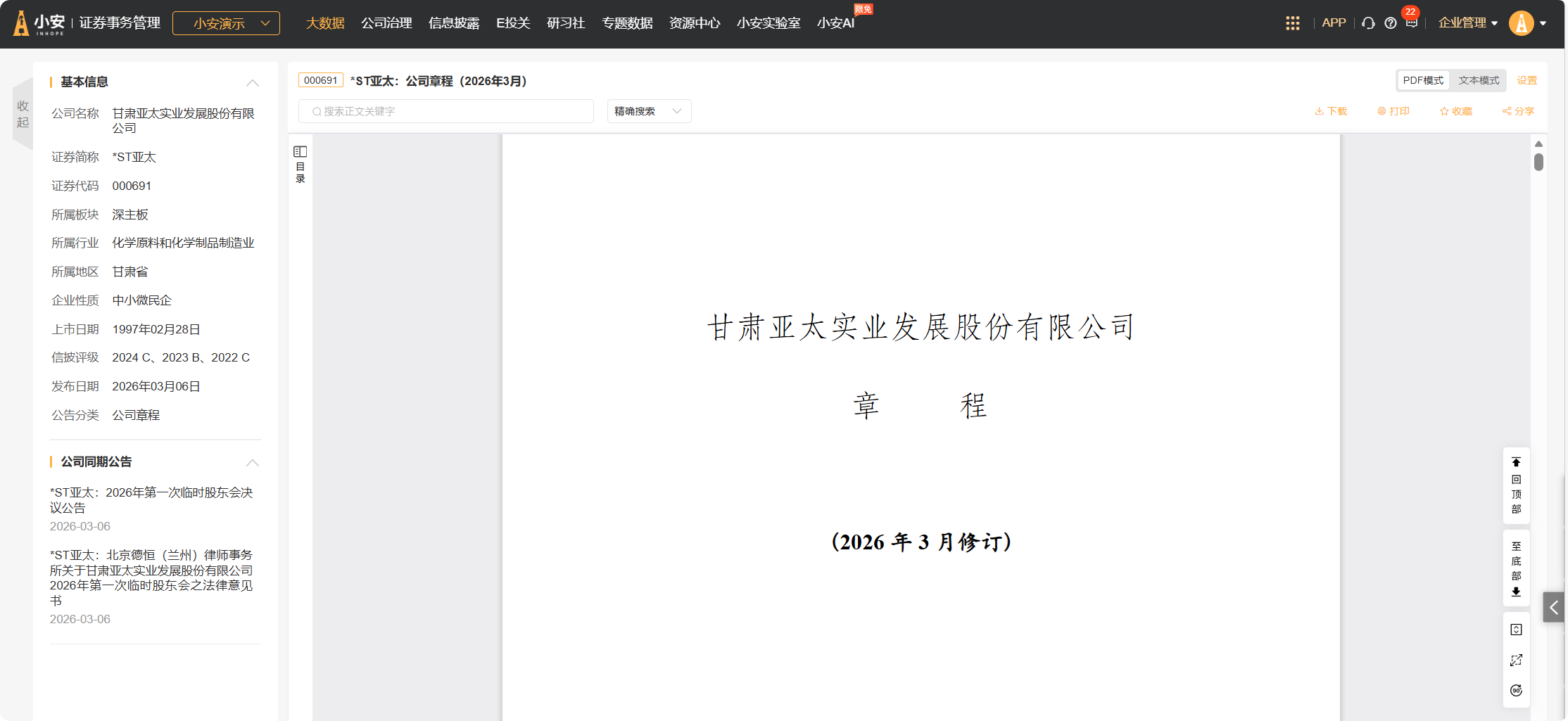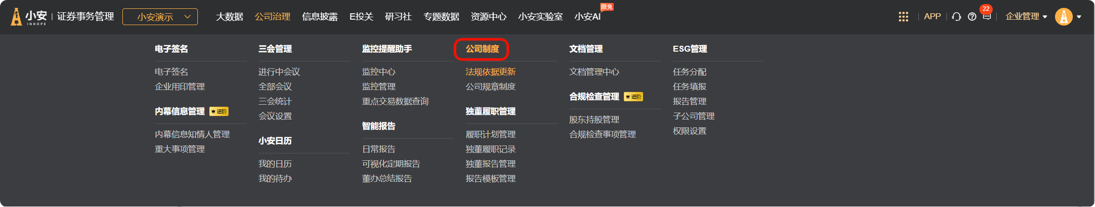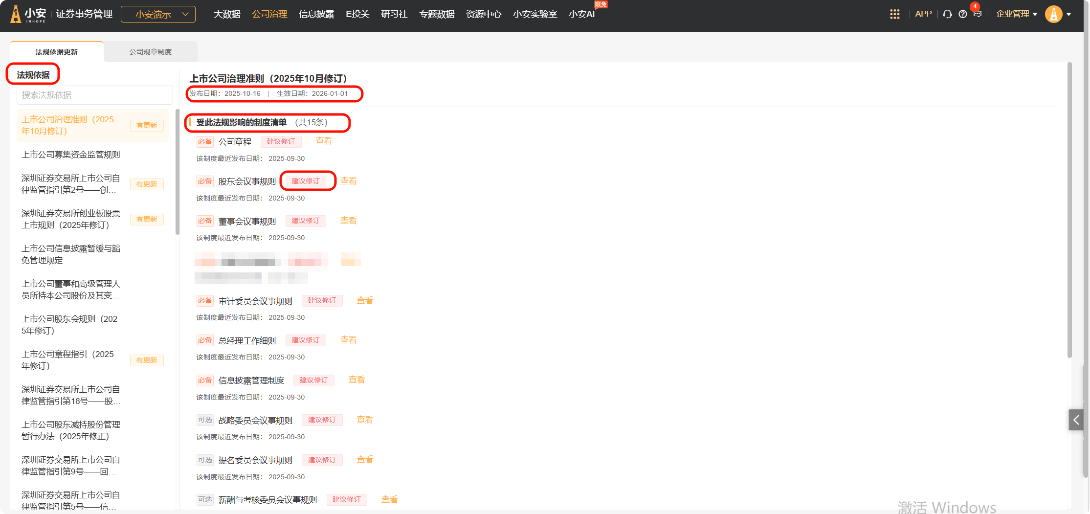在【公司治理】菜单下,点击【公司制度】菜单,进入【法规依据更新】页面。