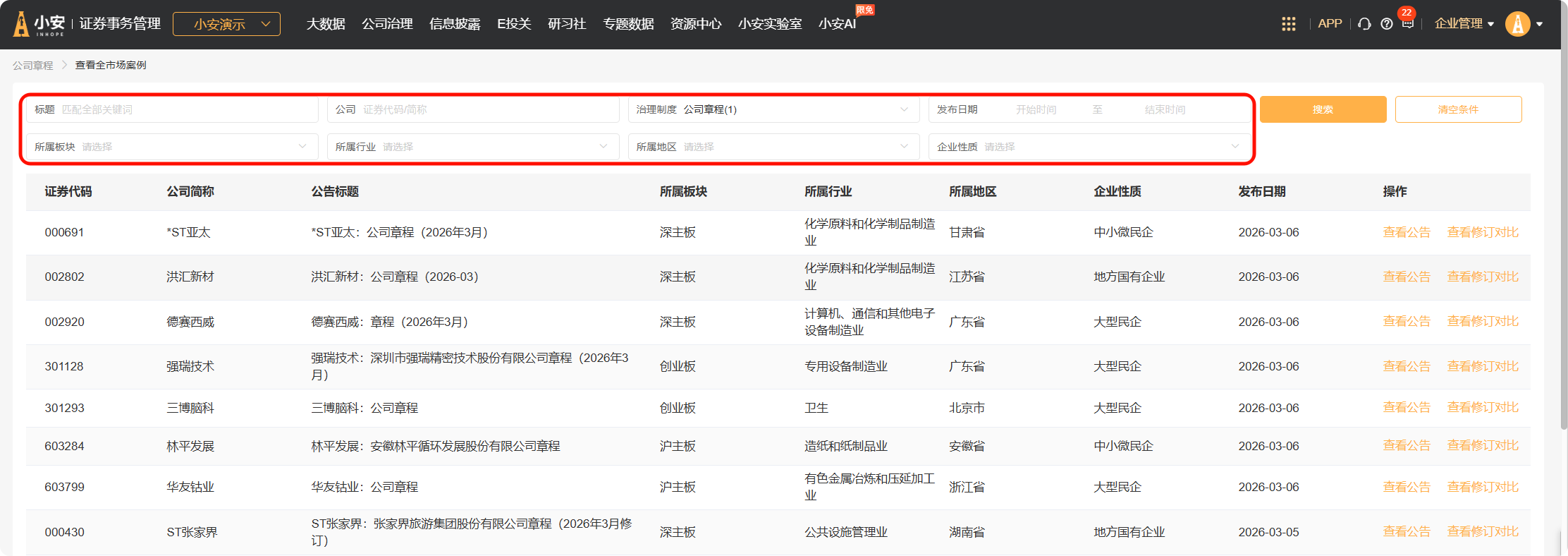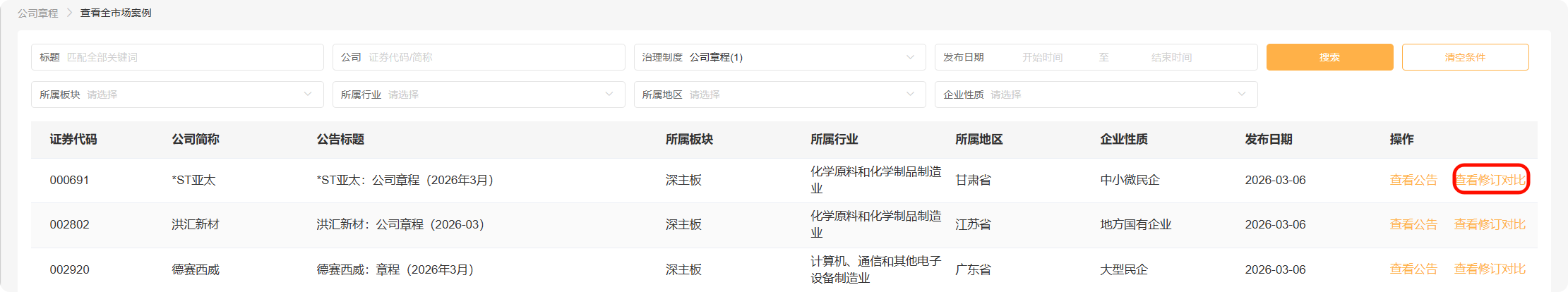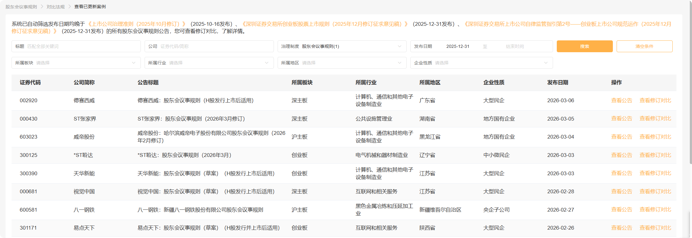 可通过标题、公司、制度类型、所属行业/板块/地区、发布时间等条件做进一步搜索。