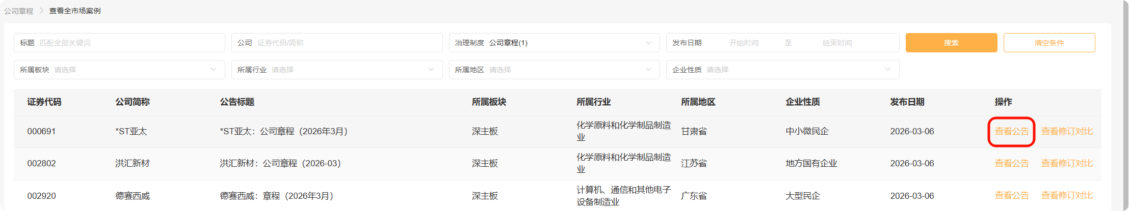 点击“查看全市场案例”,可快速查看全部A股公司披露的规章制度。