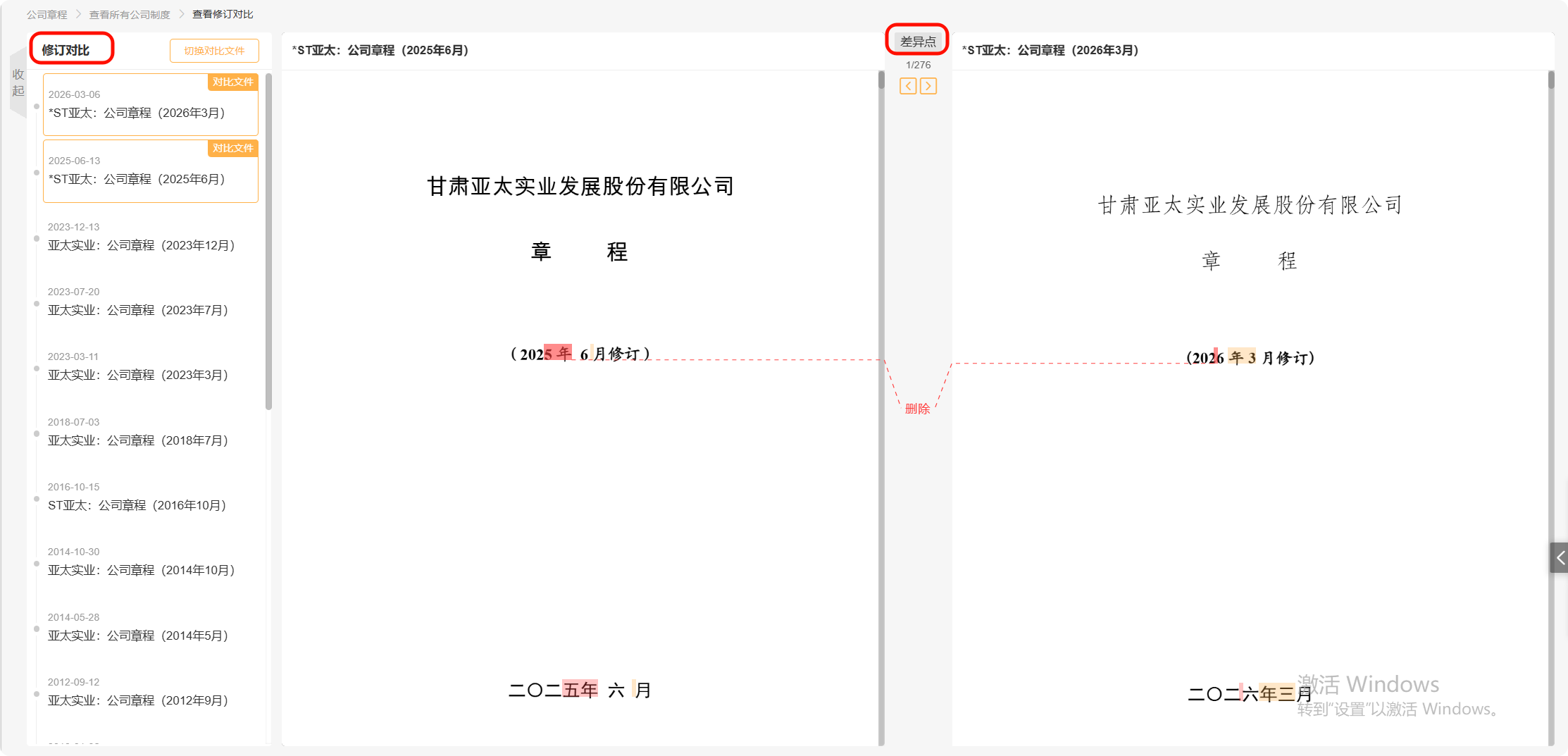 点击操作栏中的“查看修订对比”,系统将默认将当前制度与公司披露的前一版本制度进行对比,可查看两个版本之间的修订内容;