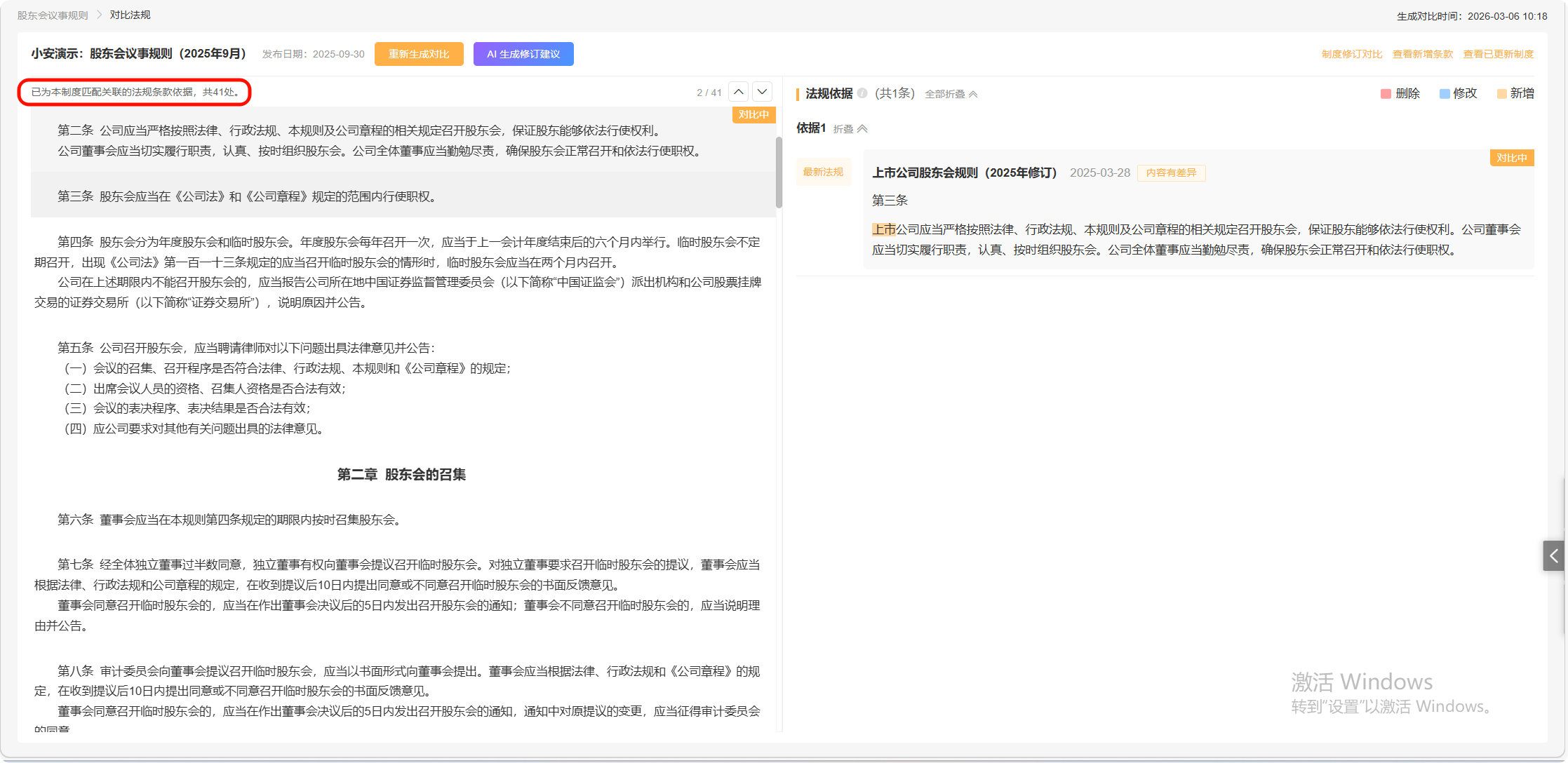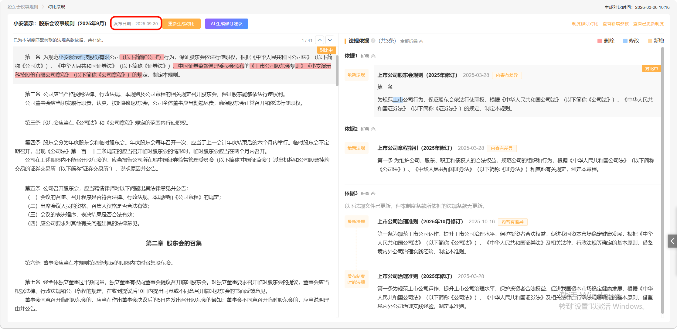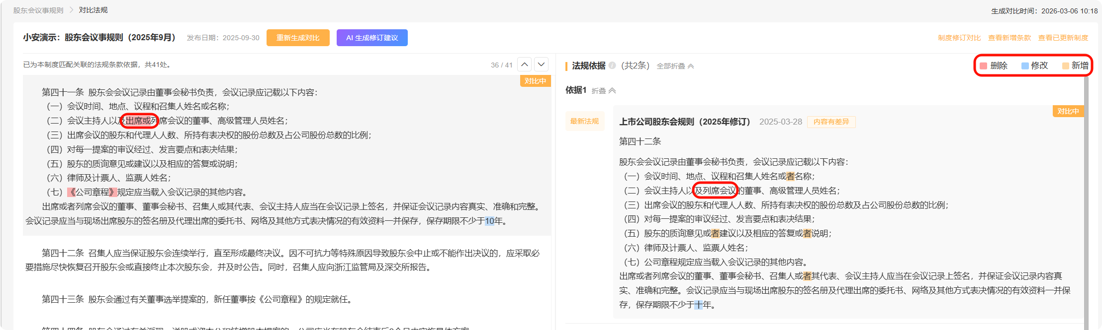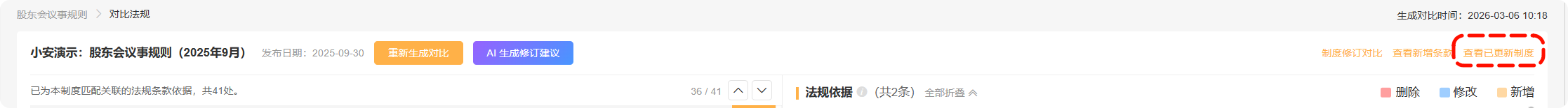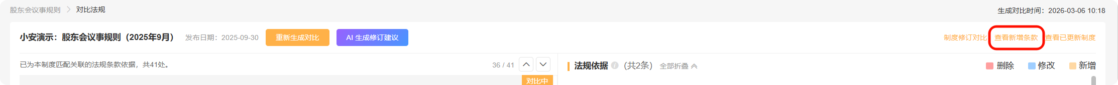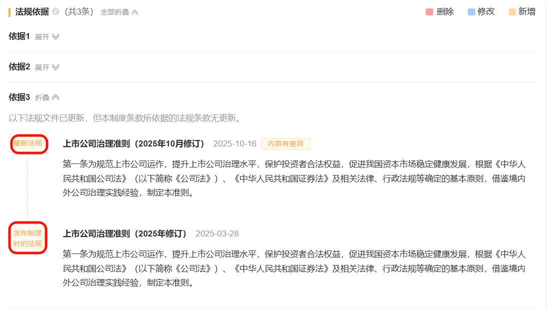 基于当前公司制度,页面仅能展示每个条款对应的法规依据(可能是未变化、已修改、已删除)。若需查看这些法规的新增条款,可以点击“查看新增条款”进行查看。