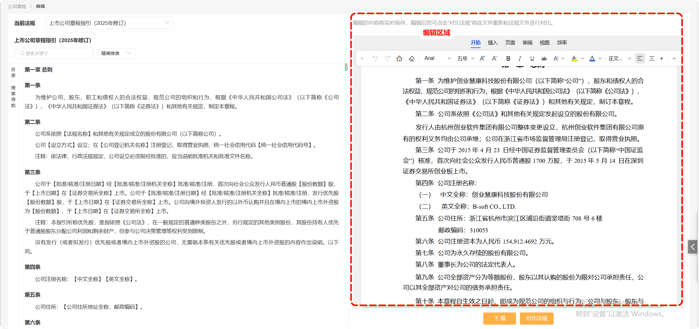 进入编辑页面,可对照左侧最新法规,在线编辑修改公司制度。