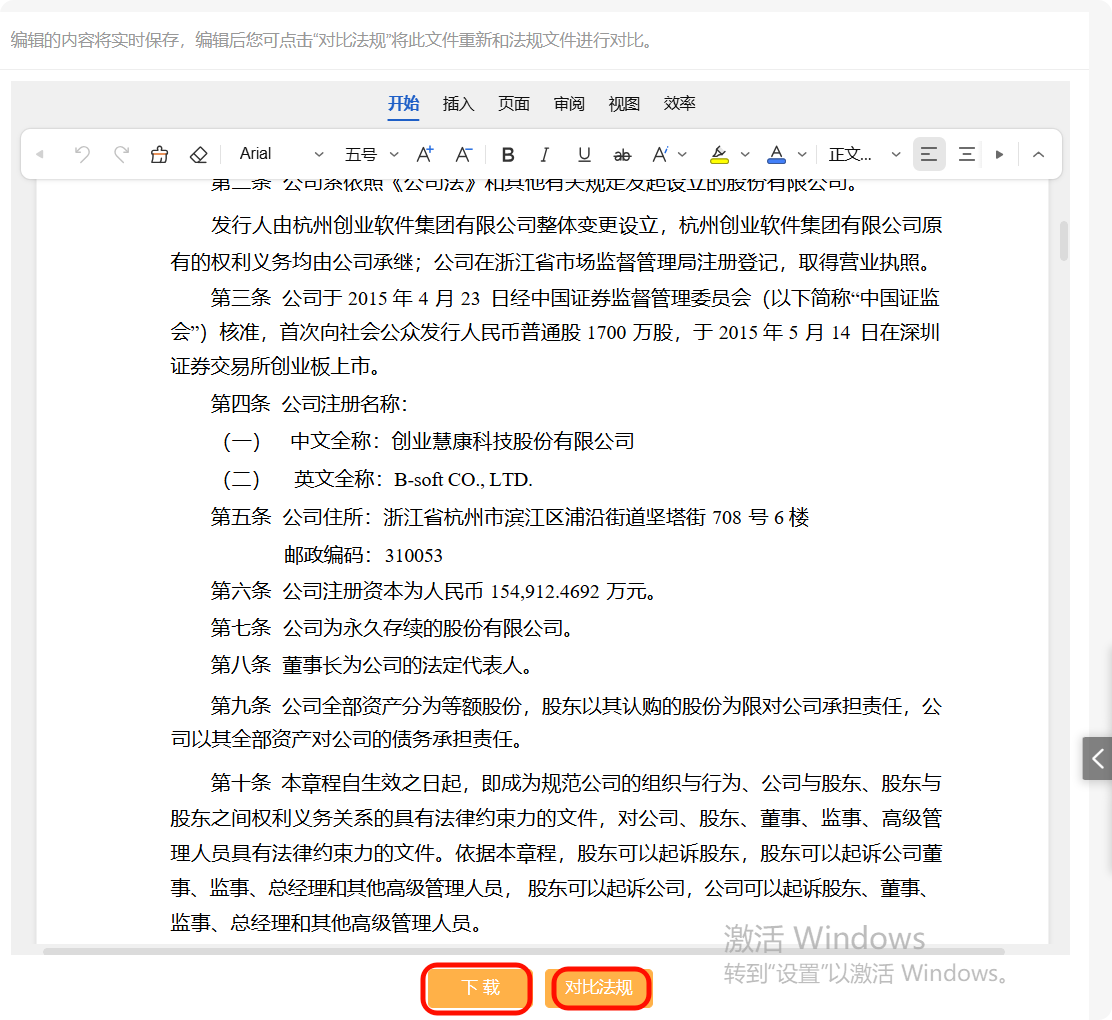 编辑修改后,可点击“对比法规”将修改后的制度再次与法规进行对比。最后一键下载更新后的制度文件