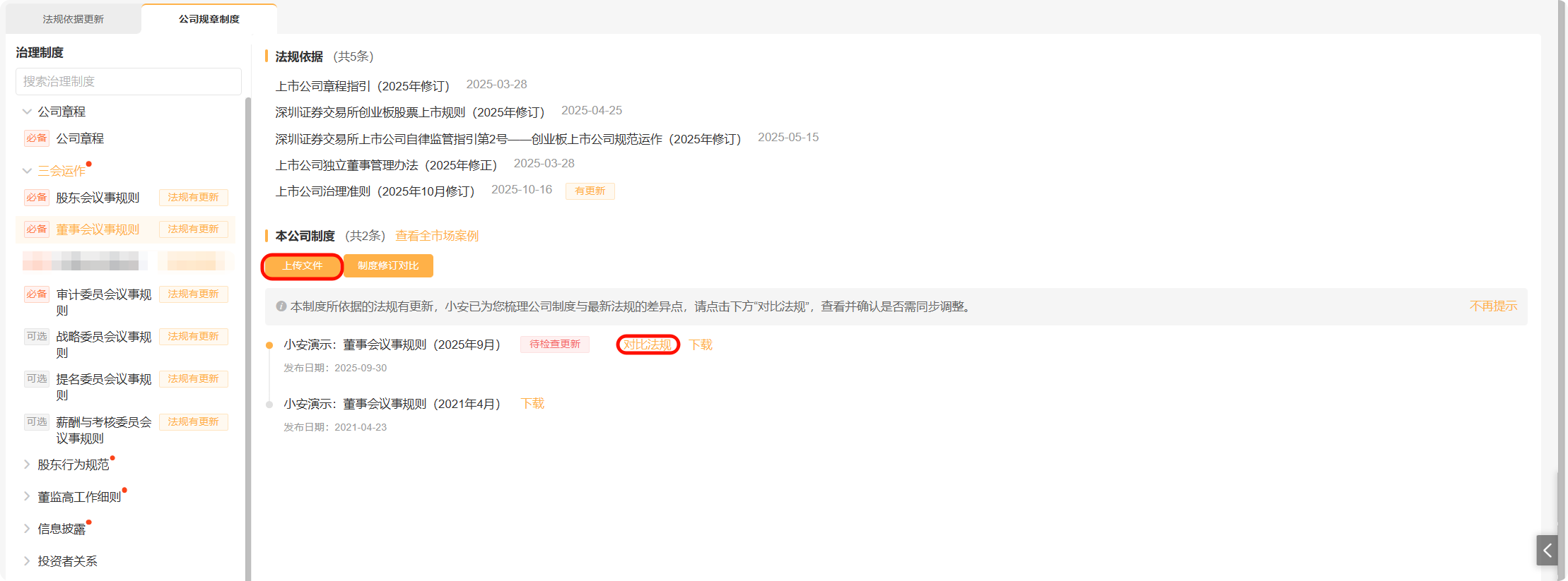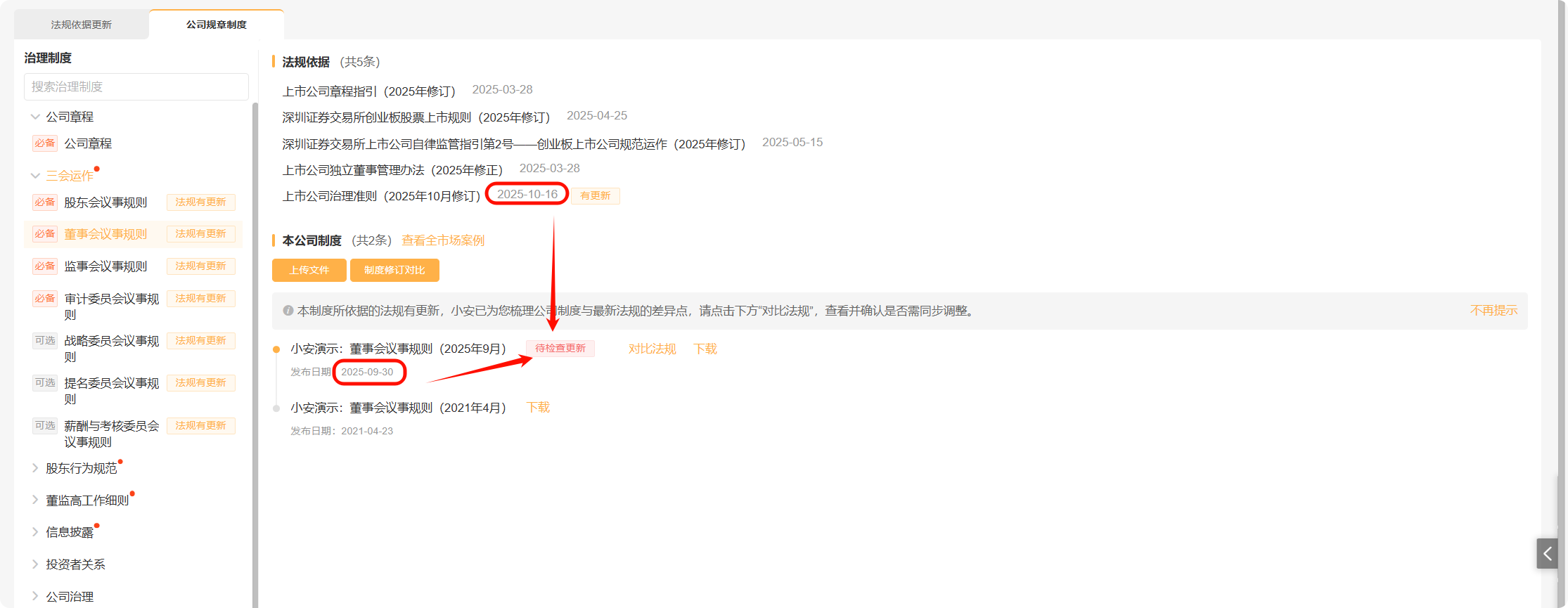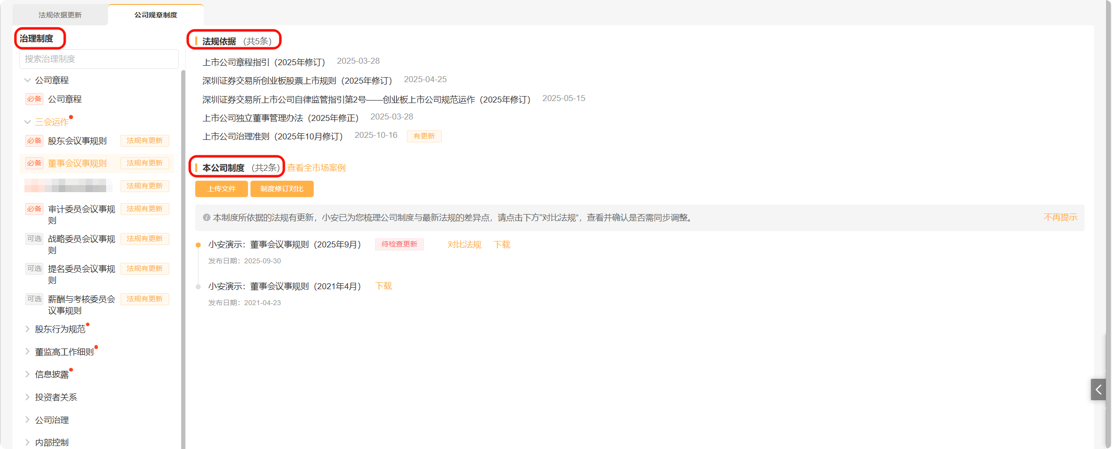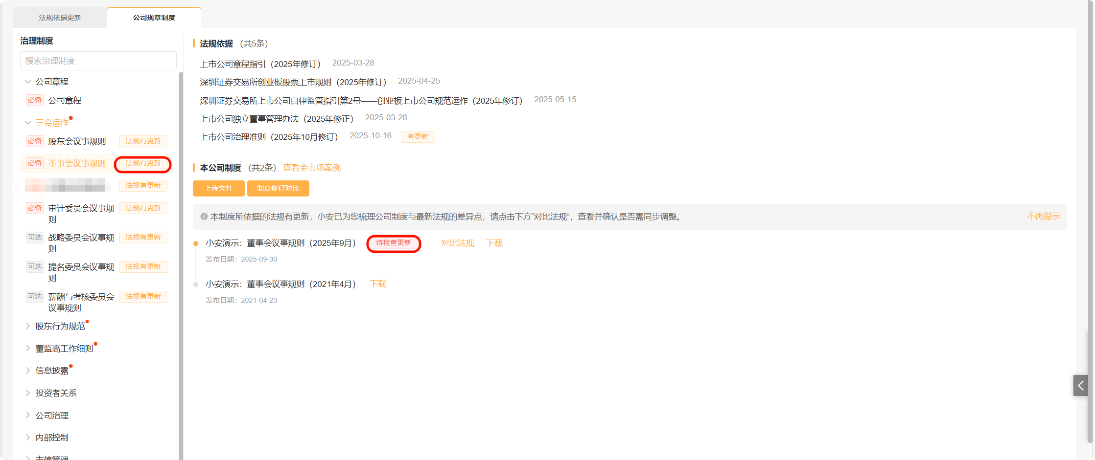 当相关法规依据发生更新时,左侧治理制度菜单中将提示“法规有更新”,并且在右侧法规依据中,更新法规后方将带上“有更新”标识。