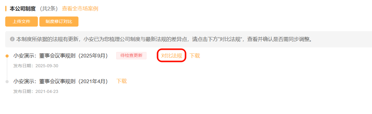 详情页左侧为公司制度,若上传的公司制度文件有修改,可点此按钮重新进行对比。