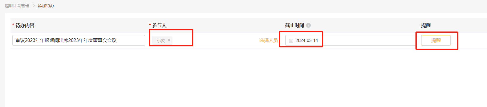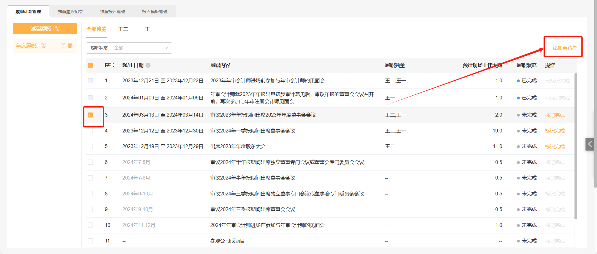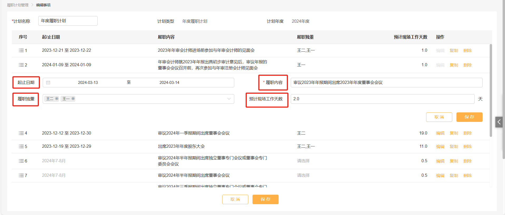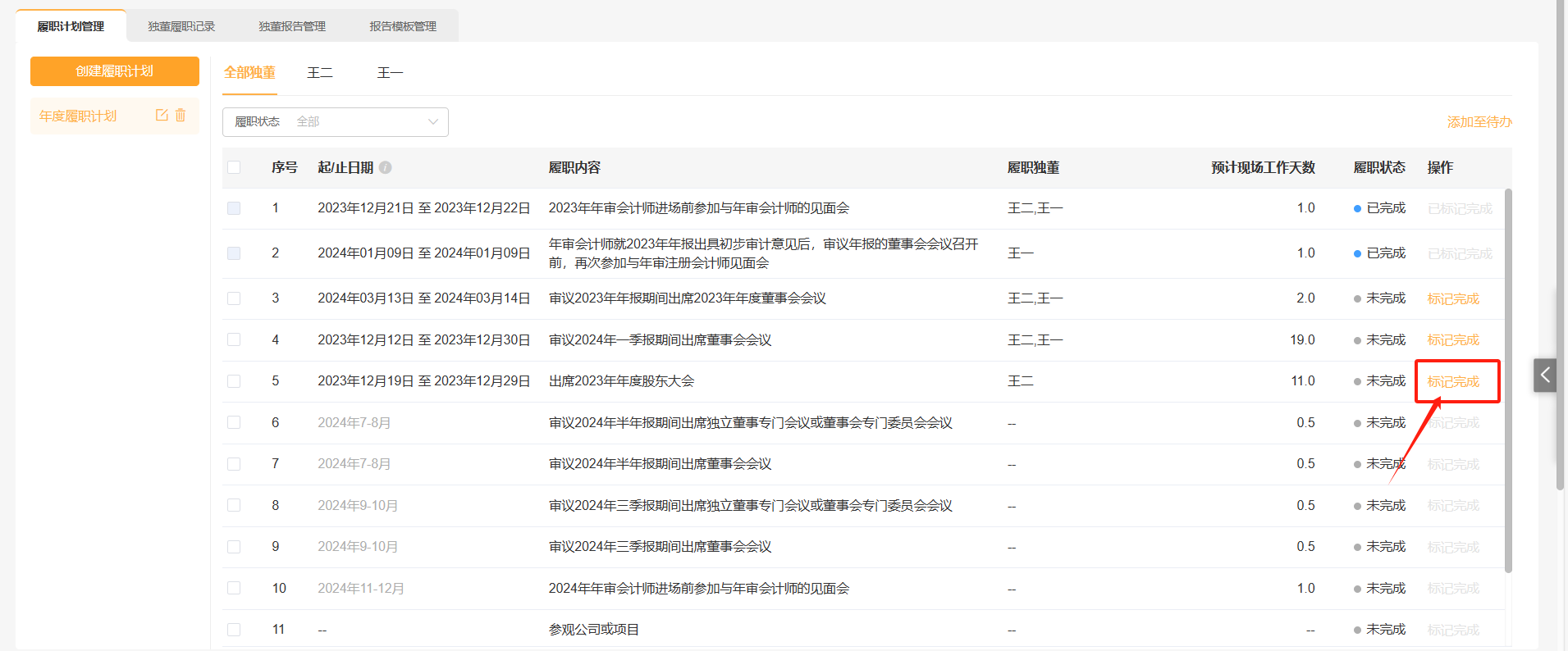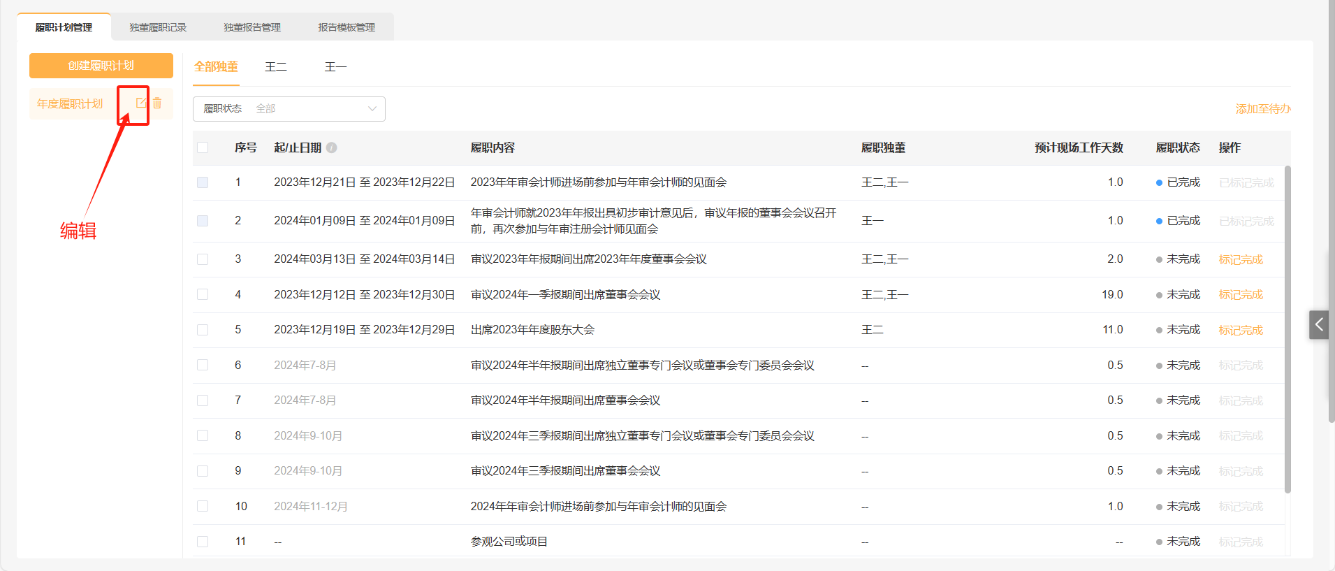 系统已提前预设未来一年独董需要履行的职责事项,点击编辑按钮,可以对履职任务进行分解、分配和跟踪,并预估现场工作天数。