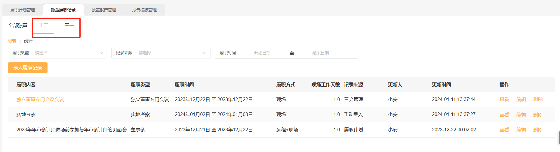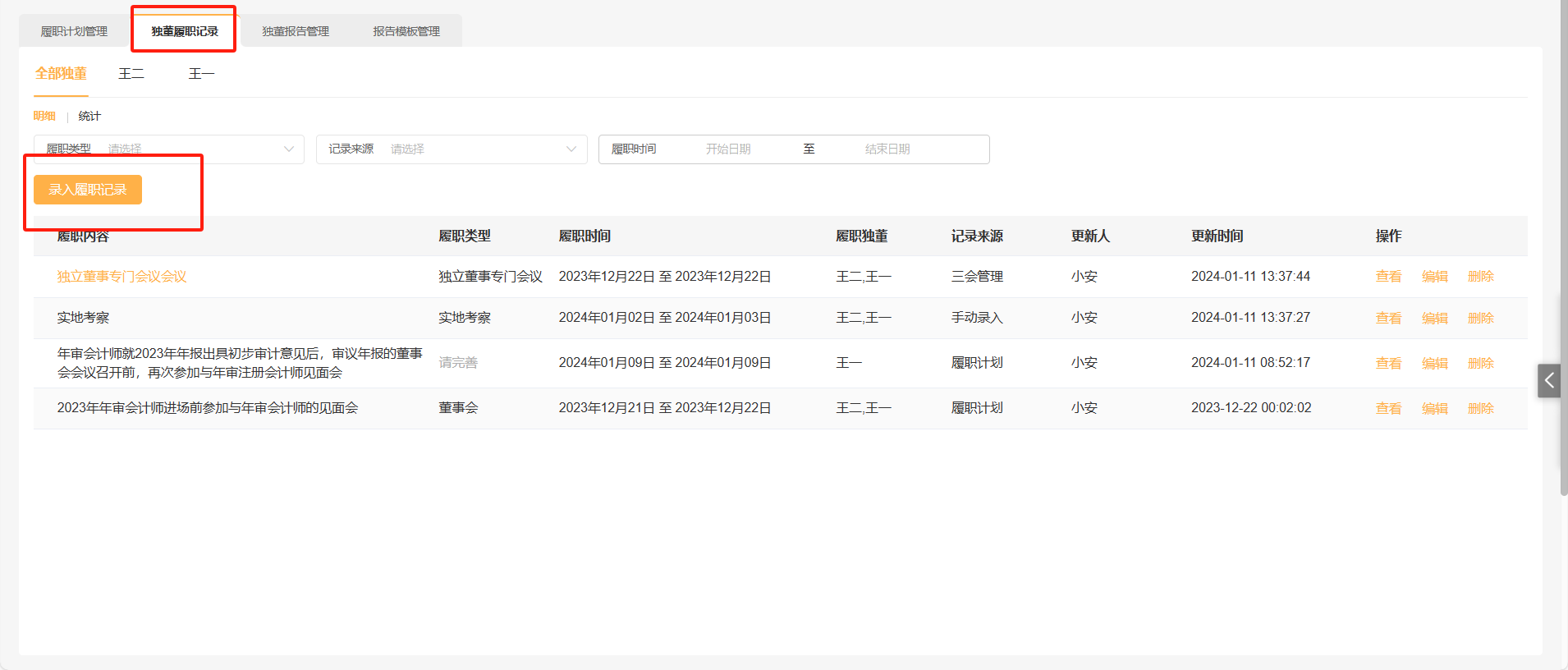 切换至“独董履职记录”页面,可以从履职计划管理导入记录或录入履职记录。